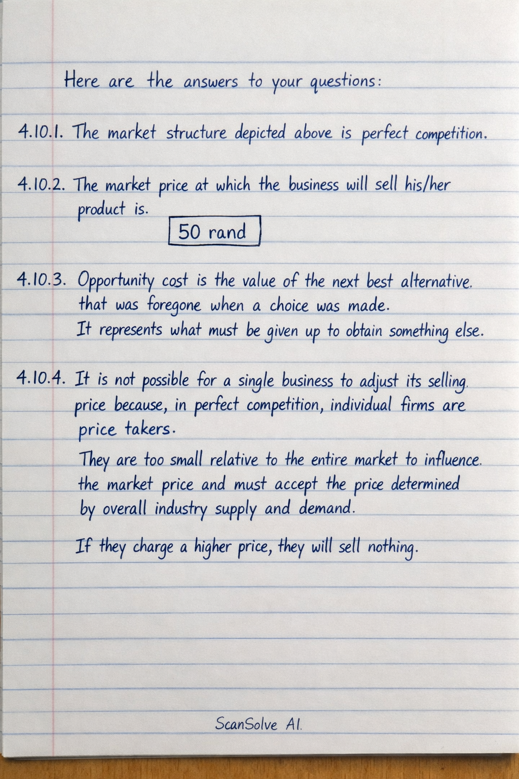 4.10.4. It is not possible for a single business to adjust its selling price because, in perfect competition, individual firms are price takers. They are too small relative to the entire market to influence the market price and must accept the price determined by overall industry supply and demand. If they charge a higher price, they will sell nothing.