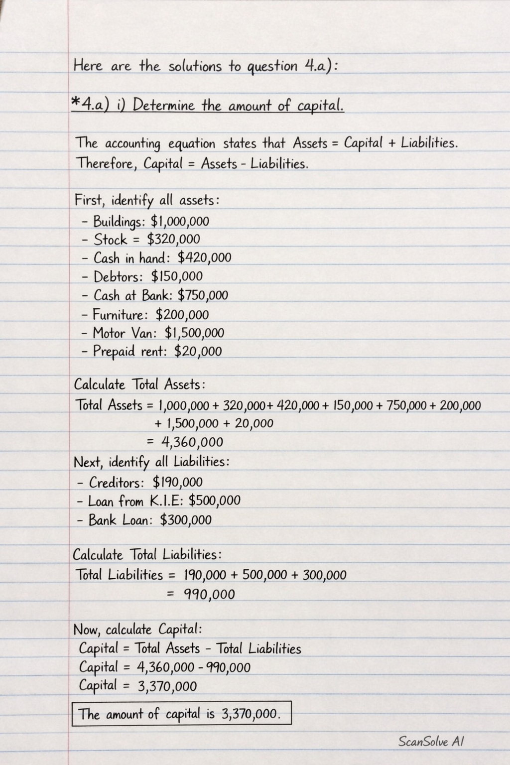ASSETSNon−CurrentAssetsBuildingsFurnitureMotorVanTotalNon−CurrentAssetsCurrentAssetsStockDebtorsPrepaidrentCashinhandCashatBankTotalCurrentAssetsTOTALASSETSCAPITALANDLIABILITIESCapitalCapital(ascalculatedini))Non−CurrentLiabilitiesLoanfromK.I.EBankLoanTotalNon−CurrentLiabilitiesCurrentLiabilitiesCreditorsTotalCurrentLiabilitiesTOTALCAPITALANDLIABILITIES1,000,000200,0001,500,0002,700,000320,000150,00020,000420,000750,0001,660,0004,360,0003,370,000500,000300,000800,000190,000190,0004,360,000
