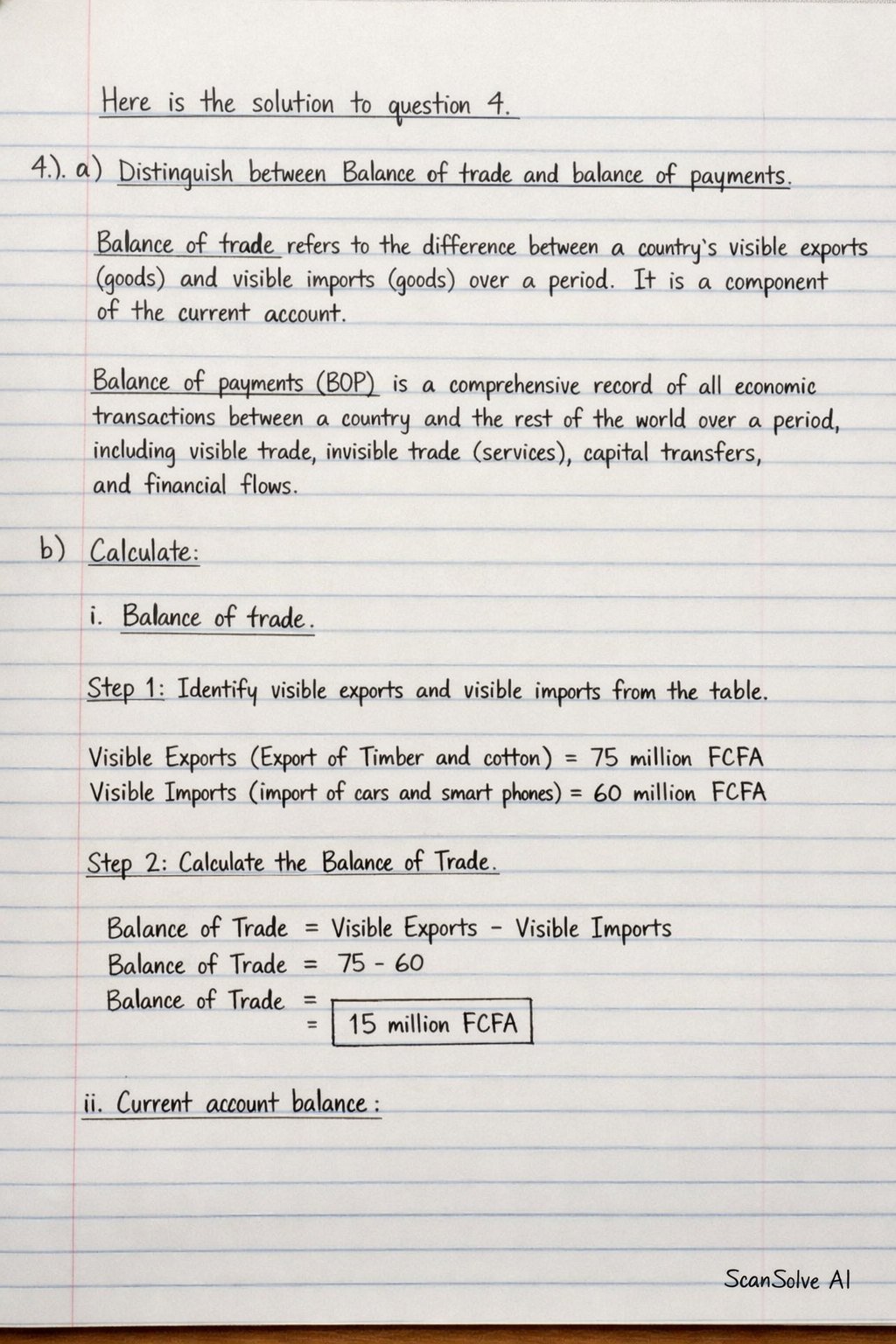 Step 1: Identify visible exports and visible imports from the table. Visible Exports (Export of Timber and cotton) = 75 million FCFA Visible Imports (Import of cars and smart phones) = 60 million FCFA