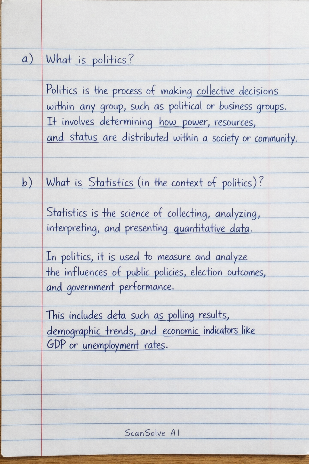 b) What is Statistics (in the context of politics)? Statistics is the science of collecting, analyzing, interpreting, and presenting quantitative data. In politics, it is used to measure and analyze the influences of public policies, election outcomes, and government performance. This includes data such as polling results, demographic trends, and economic indicators like GDP or unemployment rates.