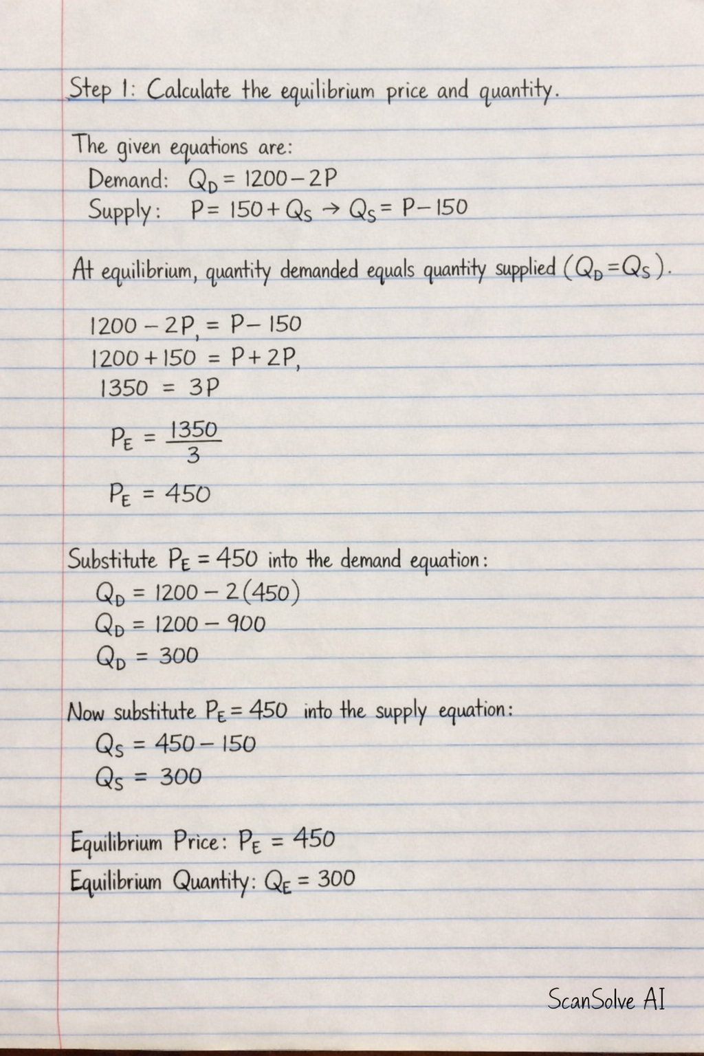 Supply: $P = 150 + Q_S \implies Q_S = P - 150$