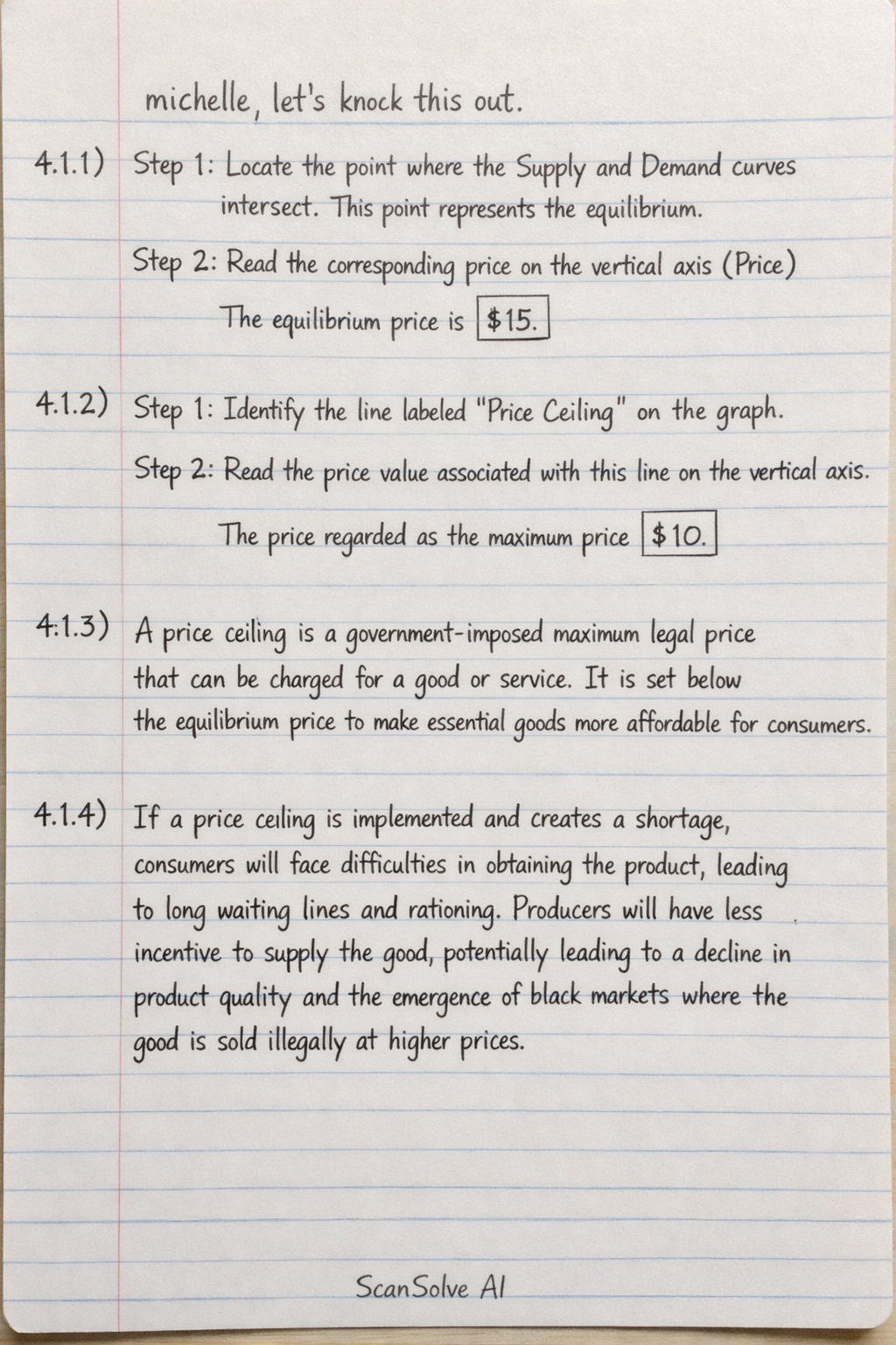 4.1.4) If a price ceiling is implemented and creates a shortage, consumers will face difficulties in obtaining the product, leading to long waiting lines and rationing. Producers will have less incentive to supply the good, potentially leading to a decline in product quality and the emergence of black markets where the good is sold illegally at higher prices.