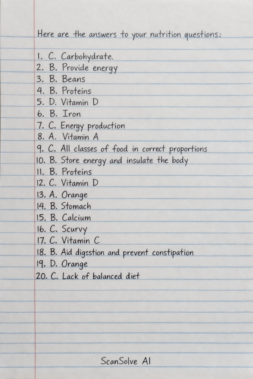 Nutrition ✅ --- 1. Which of the following is a macronutrient? A. Vitamin C B. Iron C. Carbohydrate D. Zinc --- 2. The main function of carbohydrates in the body is to: A. Build tissues B. Provide energy C. Regulate metabolism D. Form enzymes --- 3. Which of the following foods is richest in protein? A. Rice B. Beans C. Yam D. Butter --- 4. Kwashiorkor is caused by deficiency of: A. Carbohydrates B. Proteins C. Vitamins D. Fats --- 5. Which vitamin is obtained mainly from sunlight? A. Vitamin A B. Vitamin B C. Vitamin C D. Vitamin D --- 6. The mineral needed for formation of haemoglobin is: A. Calcium B. Iron C. Iodine D. Sodium --- 7. Which of the following is NOT a function of water in the body? A. Transport of nutrients B. Temperature regulation C. Energy production D. Waste removal --- 8. Night blindness is caused by deficiency of: A. Vitamin A B. Vitamin B C. Vitamin C D. Vitamin K --- 9. Which of the following is a balanced diet? A. Rice and beans only B. Yam and oil C. All classes of food in correct proportions D. Fruits only --- 10. Fats are important because they: A. Supply quick energy only B. Store energy and insulate the body C. Build muscles D. Form enzymes --- 11. Which class of food helps in body building? A. Carbohydrates B. Proteins C. Vitamins D. Minerals --- 12. Rickets in children is caused by deficiency of: A. Vitamin A B. Vitamin C C. Vitamin D D. Vitamin K --- 13. Which of the following is a source of vitamin C? A. Orange B. Egg C. Fish D. Rice --- 14. The digestion of protein begins in the: A. Mouth B. Stomach C. Small intestine D. Large intestine --- 15. Which of the following minerals is important for strong bones and teeth? A. Iron B. Calcium C. Potassium D. Sodium --- 16. Which of the following is a deficiency disease? A. Diabetes B. Hypertension C. Scurvy D. Cancer --- 17. Scurvy is caused by lack of: A. Vitamin A B. Vitamin B C. Vitamin C D. Vitamin D --- 18. Roughage in food helps to: A. Provide energy B. Aid digestion and prevent constipation C. Build muscles D. Store fat --- 19. Which of the following is NOT a source of fat? A. Palm oil B. Butter C. Groundnut D. Orange --- 20. Malnutrition refers to: A. Eating too much food B. Eating too little food C. Lack of balanced diet D. Eating only carbohydrates