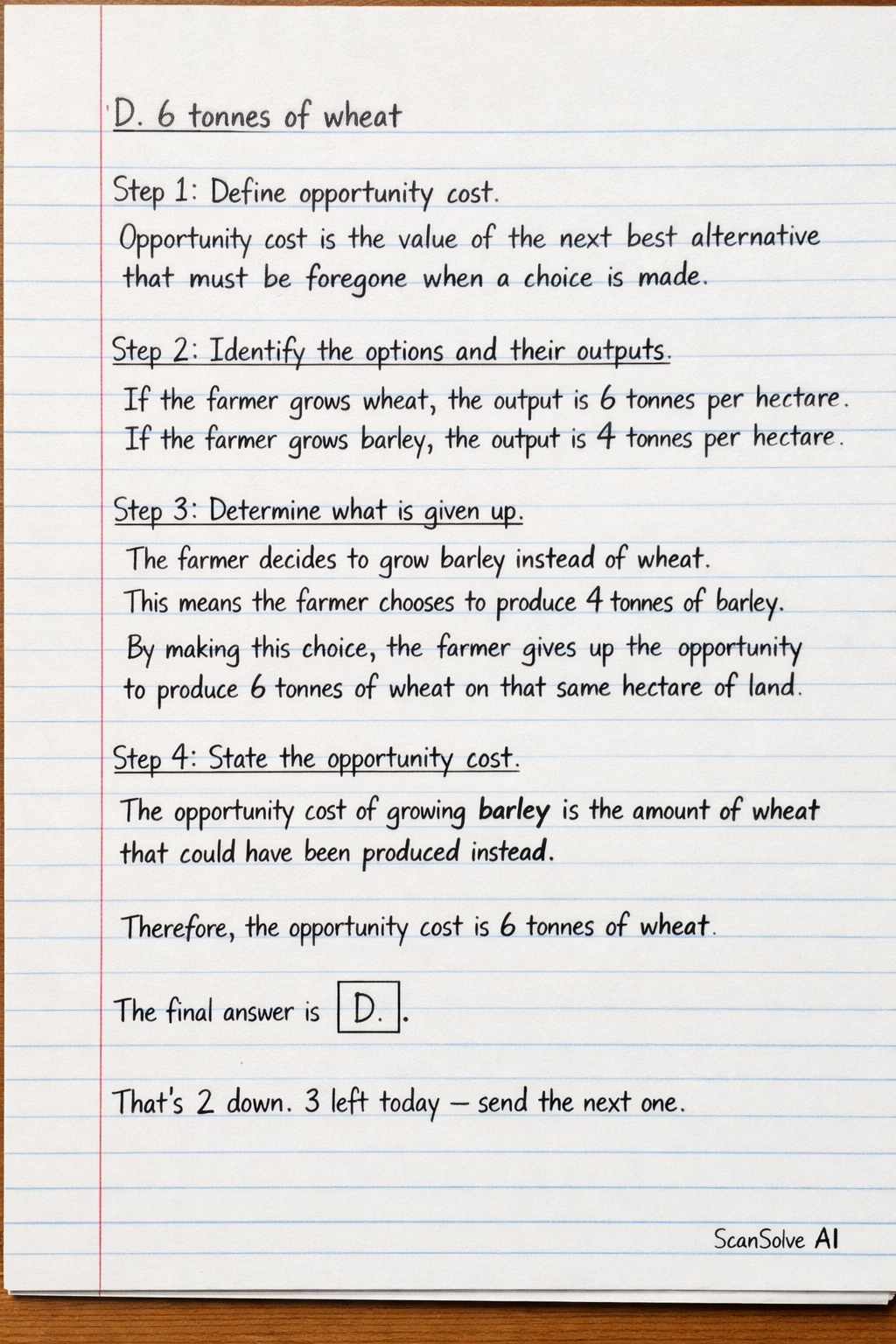 Step 3: Determine what is given up. The farmer decides to grow barley instead of wheat. This means the farmer chooses to produce 4 tonnes of barley. By making this choice, the farmer gives up the opportunity to produce 6 tonnes of wheat on that same hectare of land.