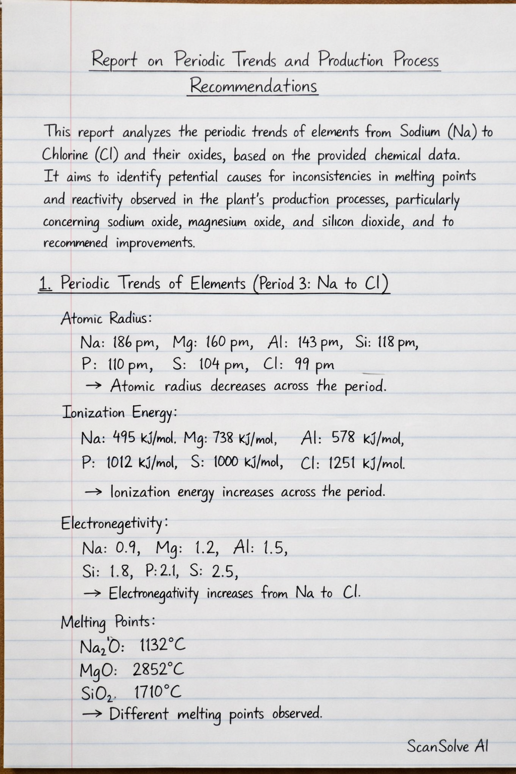 This report analyzes the periodic trends of elements from Sodium (Na) to Chlorine (Cl) and their oxides, based on the provided chemical data. It aims to identify potential causes for inconsistencies in melting points and reactivity observed in the plant's production processes, particularly concerning sodium oxide, magnesium oxide, and silicon dioxide, and to recommend improvements.