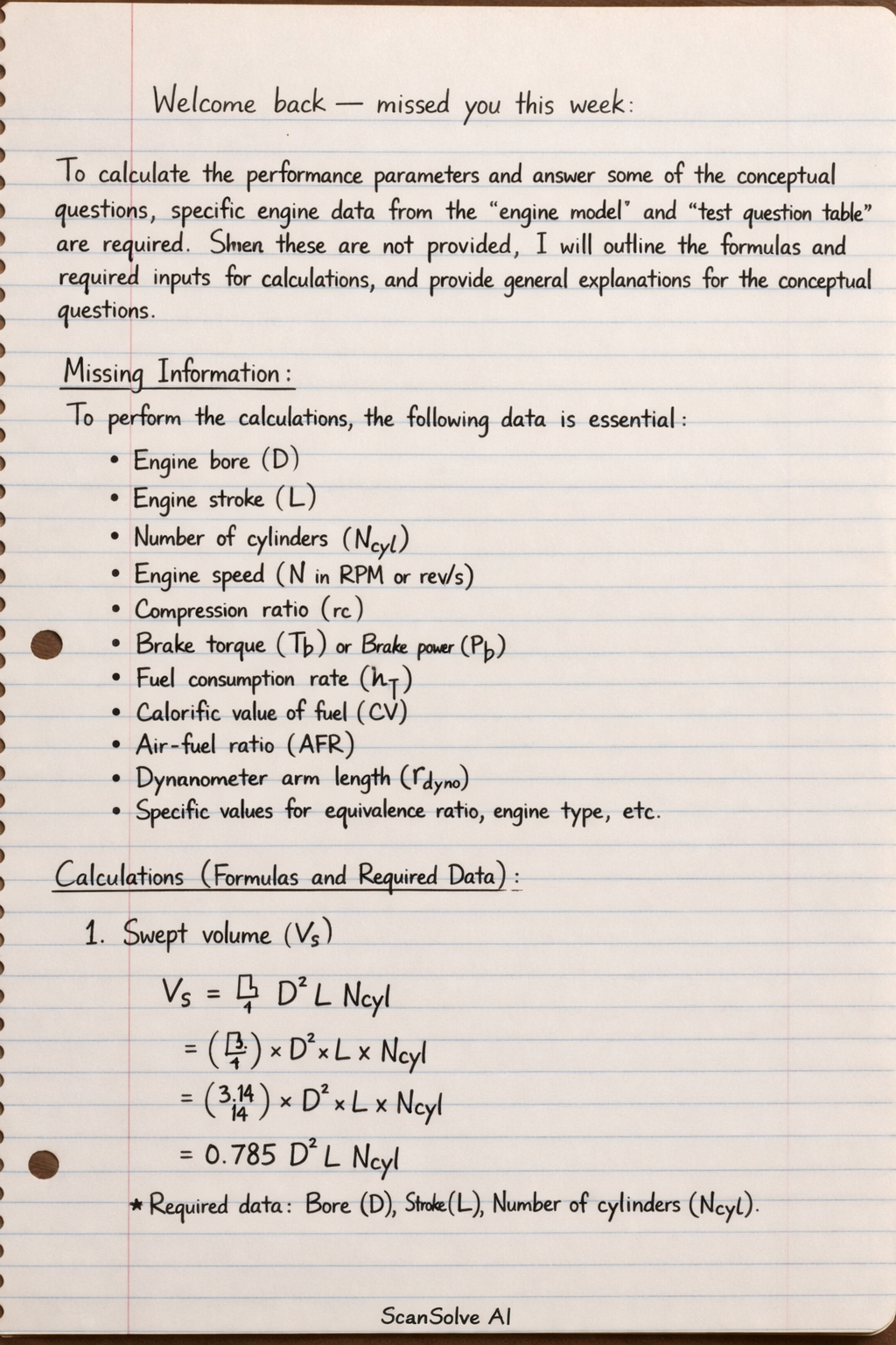 Teaser / foresight draft for further thoughts /self study 10 Marks to supplement the poor test score. To be orally defended…. Use the engine model to calculate the performance of the engine such as Swept volume Clearance volume Indicated power if mechanical efficiency is 85% Frictional power Fuel power Brake mean effective pressure Frictional mean effective pressure Indicated load if the net brake load is 167N from 3 cylinders Mean piston speed Brake thermal and indicated thermal efficiency Predict the combustion performance of the engine if the exhaust temperatures from the three cylinders are 350, 379 and 380 degree Celsius Judging from your prediction, is the engine Time correct? Is there a problem with the lubrication and cooling system? Justify your reasons? Using equivalence ratio, discuss the nature of the mixture Engine specific volume Stroke to bore ratio Engine capacity in c.cm Propose the cycle on which the engine Can operate and state your reasons Classify the engine according to stroke, speed, aspiration, fuel usage and cooling Determine the thermal balance using the information from your test question table If the engine consumed 3litres, determine the engine specific volume in Litre per kw Air consumption per hour Determine also how long the exhaust valve opening is in seconds when the peak pressure of the engine ocurs at 0.003sec after the flame front if the exhaust valve opens at 10 degrees