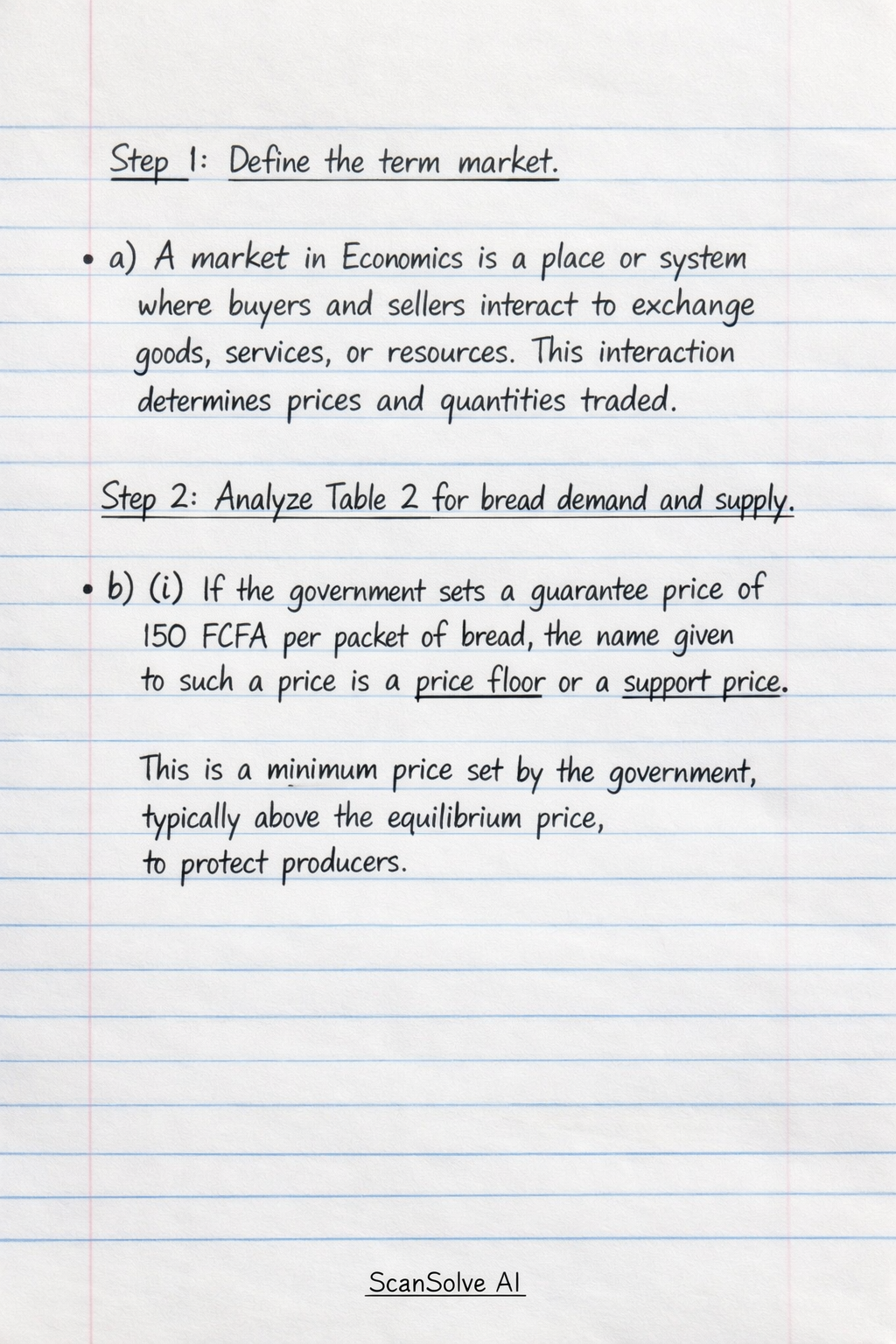b) (i) If the government sets a guarantee price of 150 FCFA per packet of bread, the name given to such a price is a price floor or a support price*. This is a minimum price set by the government, typically above the equilibrium price, to protect producers.
