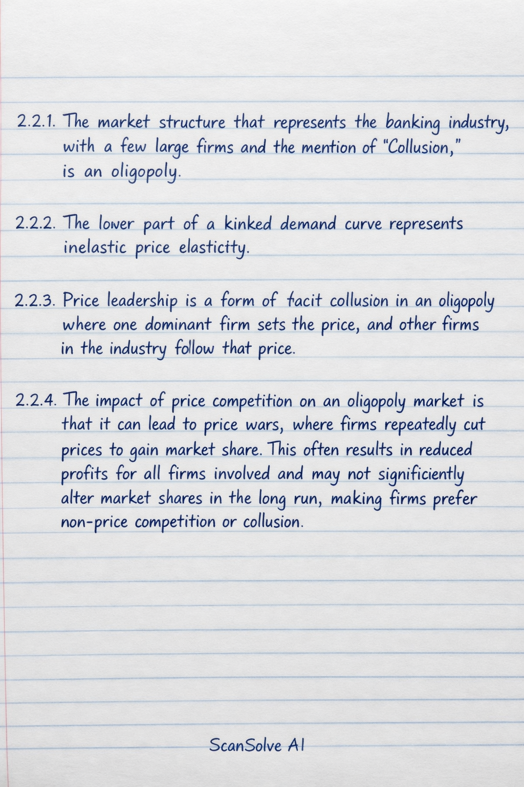 2.2.1 The market structure that represents the banking industry, with a few large firms and the mention of "Collusion," is an oligopoly.