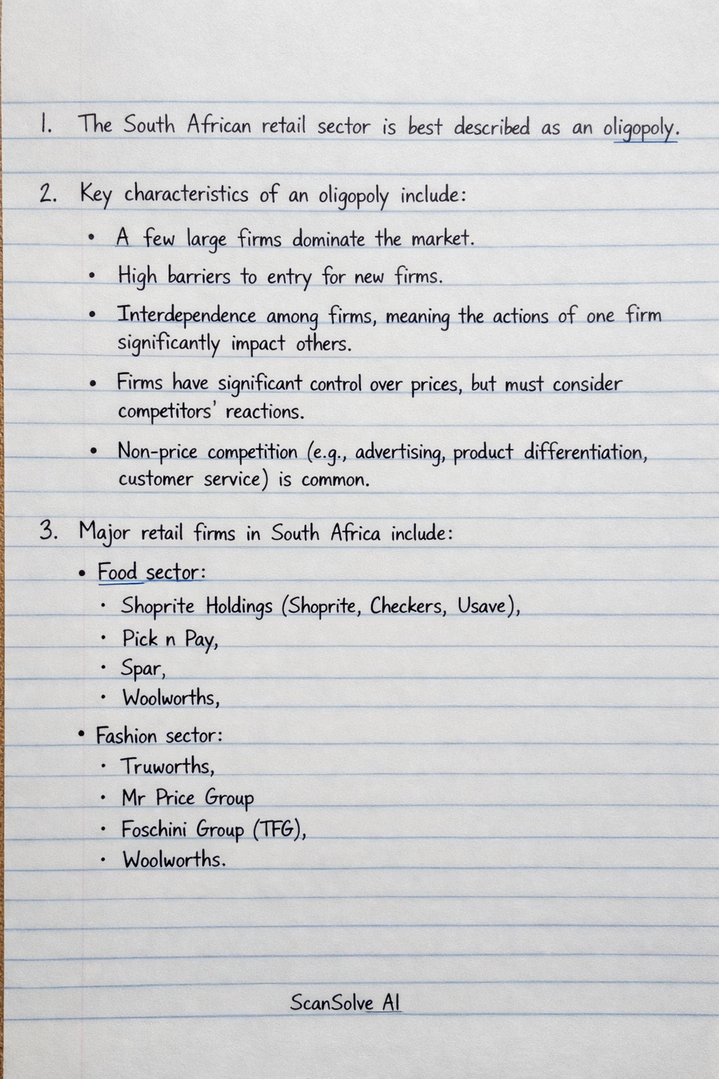 1. The South African retail sector is best described as an oligopoly. 2. Key characteristics of an oligopoly include: A few large firms* dominate the market. High barriers to entry* for new firms. Interdependence* among firms, meaning the actions of one firm significantly impact others. Firms have significant control over prices*, but must consider competitors' reactions. Non-price competition* (e.g., advertising, product differentiation, customer service) is common. 3. Major retail firms in South Africa include: Food sector*: Shoprite Holdings (Shoprite, Checkers, Usave), Pick n Pay, Spar, Woolworths. Fashion sector*: Truworths, Mr Price Group, Foschini Group (TFG), Woolworths. 4. These firms have significant control over prices. In an oligopoly, firms are not price takers; they have market power to influence prices. However, their pricing decisions are interdependent, meaning they must anticipate and react to competitors' pricing strategies. This can lead to price leadership, tacit collusion, or intense price competition. 5. Retail firms increase their market share through several strategies: Product differentiation*: Offering unique product ranges, private labels, or premium quality (e.g., Woolworths). Extensive marketing and advertising*: Building brand loyalty and attracting customers through promotions and campaigns. Store expansion and format diversification*: Opening new stores in strategic locations and introducing different store formats (e.g., smaller convenience stores, larger hypermarkets). Competitive pricing and loyalty programs*: Offering competitive prices, discounts, and loyalty rewards to retain customers. Supply chain efficiency*: Optimizing logistics and operations to reduce costs and offer better value. E-commerce and omnichannel strategies*: Expanding online presence and integrating it with physical stores to provide seamless shopping experiences. 6. The South African retail sector faces several threats, impacting consumers: Economic downturns and low consumer spending: High unemployment, inflation, and interest rates reduce disposable income, leading to lower sales for retailers. This results in reduced purchasing power for consumers*, less product variety as retailers cut stock, and potential job losses in the sector. Rising operating costs: Increases in electricity (load shedding), fuel, labor, and rental costs squeeze retailers' profit margins. This leads to higher prices for consumers*, reduced service quality, and fewer promotions. Intense competition: From both local and international players, including the growing e-commerce sector, forces retailers to compete aggressively. While this can lead to lower prices and more choice for consumers* in the short term, it can also lead to market consolidation, potentially reducing choice in the long run if smaller retailers exit. Supply chain disruptions: Issues like port inefficiencies, global supply chain shocks, and local infrastructure challenges (e.g., road conditions) can delay stock and increase costs. This results in stockouts, higher prices due to increased logistics costs*, and reduced freshness for perishable goods for consumers. Send me the next one 📸