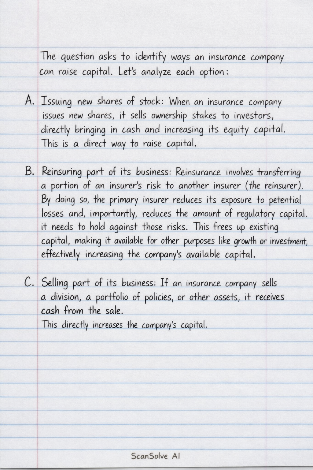 - C. Selling part of its business: If an insurance company sells a division, a portfolio of policies, or other assets, it receives cash from the sale. This directly increases the company's capital.