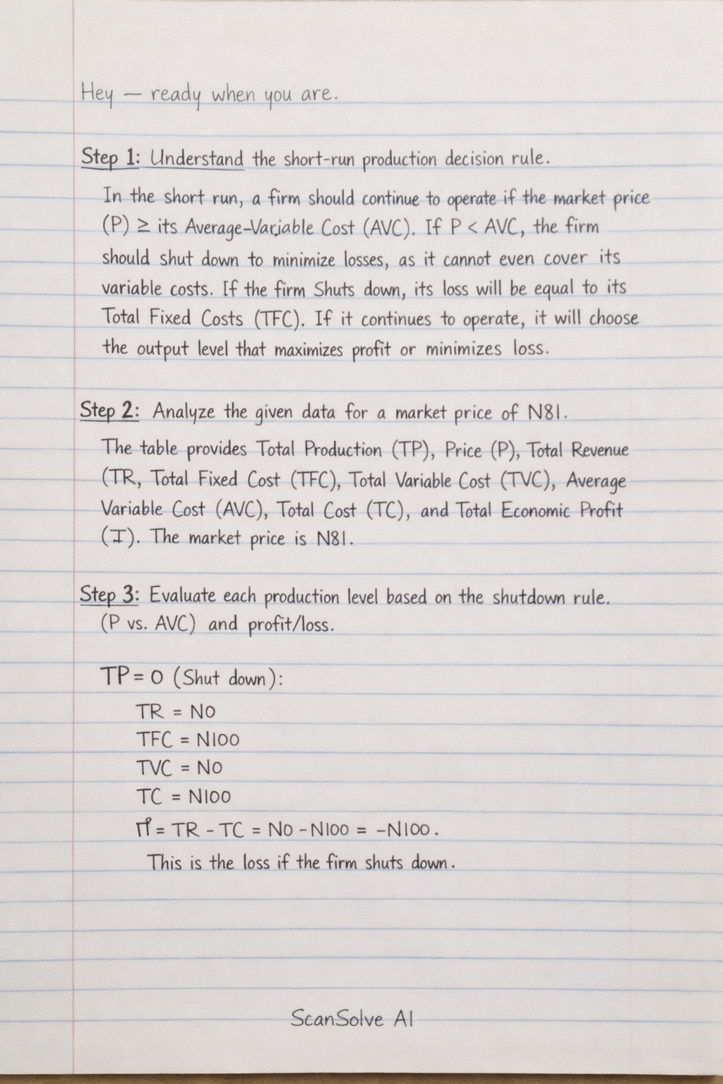 Step 2: Analyze the given data for a market price of N81. The table provides Total Production (TP), Price (P), Total Revenue (TR), Total Fixed Cost (TFC), Total Variable Cost (TVC), Average Variable Cost (AVC), Total Cost (TC), and Total Economic Profit (). The market price is N81.