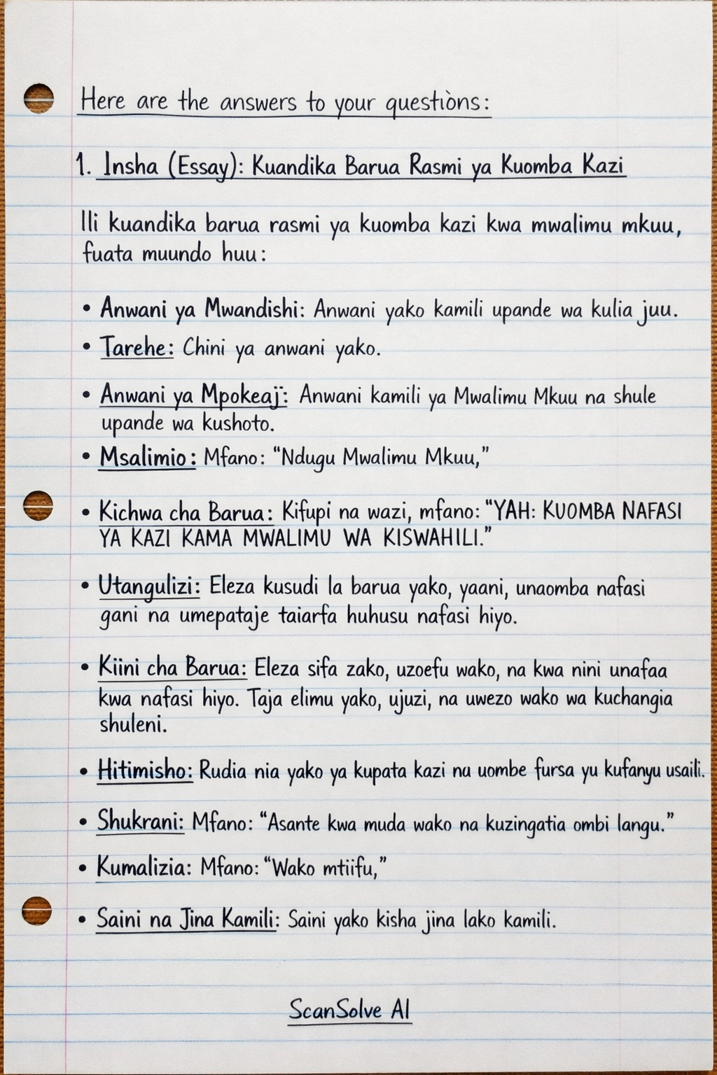 1. Insha (Essay): Kuandika Barua Rasmi ya Kuomba Kazi