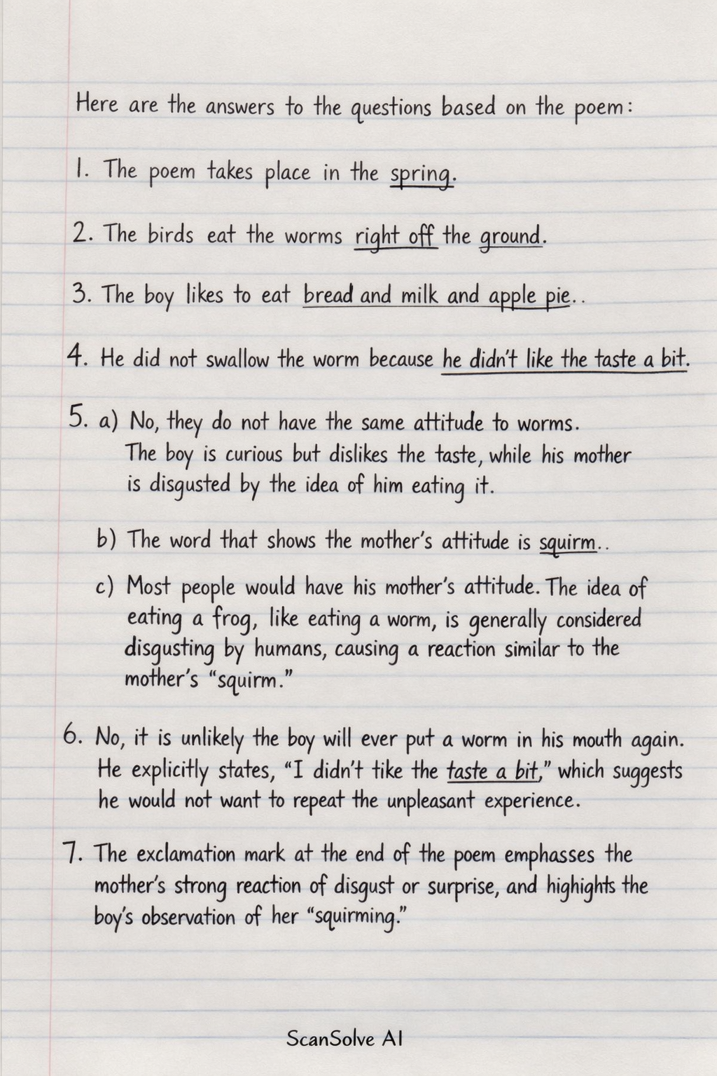 5. a) No, they do not have the same attitude to worms. The boy is curious but dislikes the taste, while his mother is disgusted by the idea of him eating it.