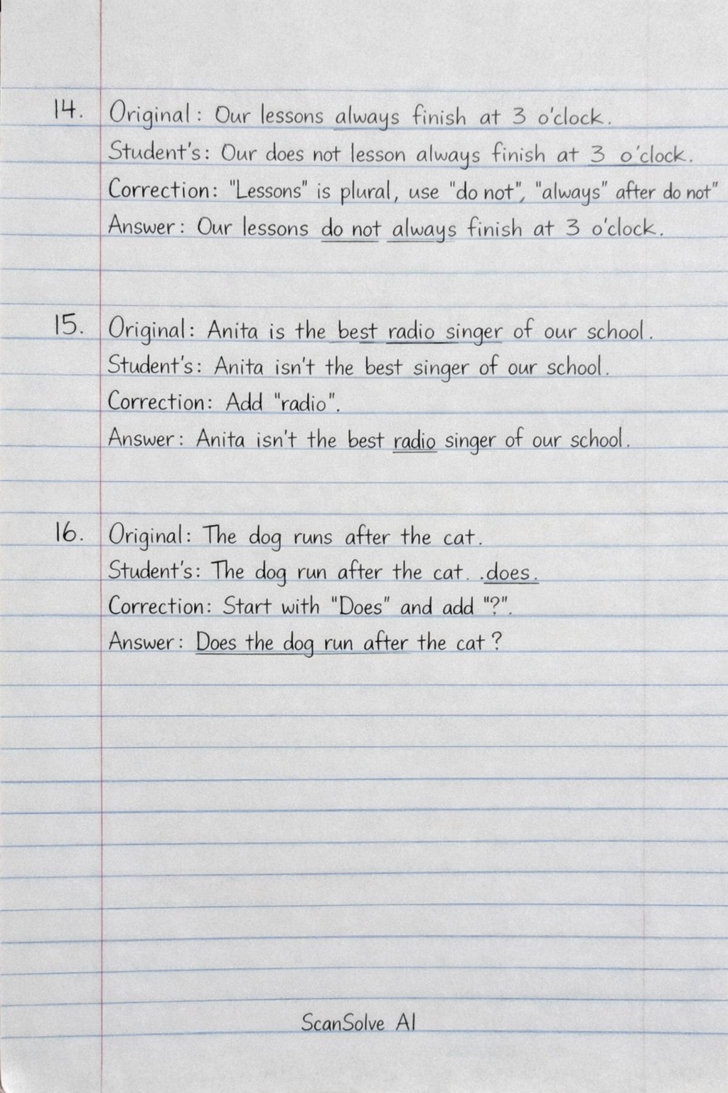 - Correction: "Lessons" is plural, so "do not" is used, and "always" comes after the auxiliary verb.
