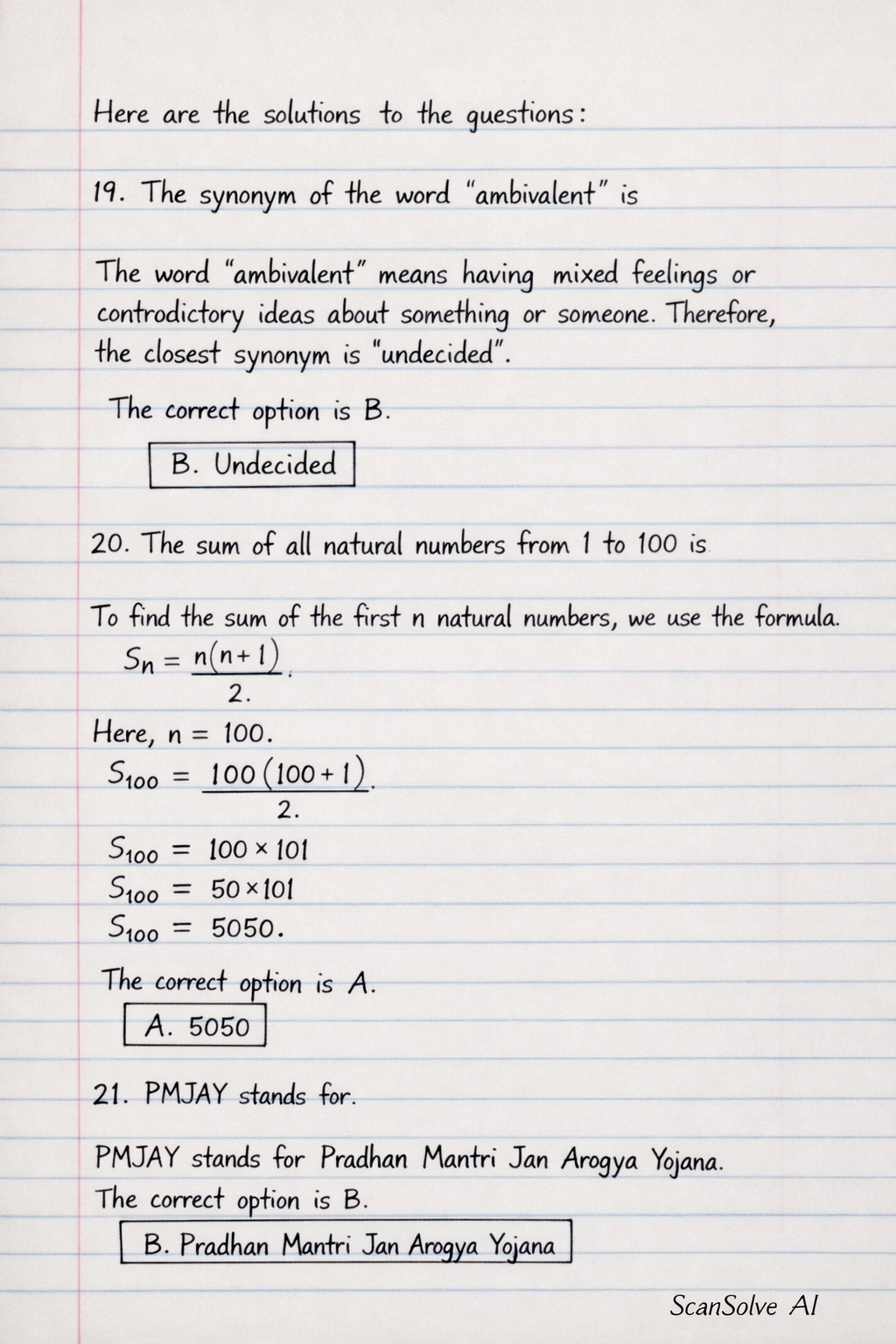 20. The sum of all natural numbers from 1 to 100 is To find the sum of the first natural numbers, we use the formula . Here, . The correct option is A.