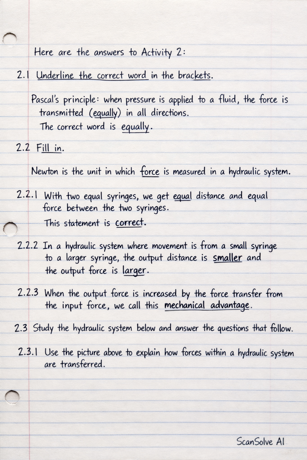2.1 Underline the correct word in the brackets. Pascal's principle: when pressure is applied to a fluid, the force is transmitted (equally / unequally) in all directions. The correct word is equally.