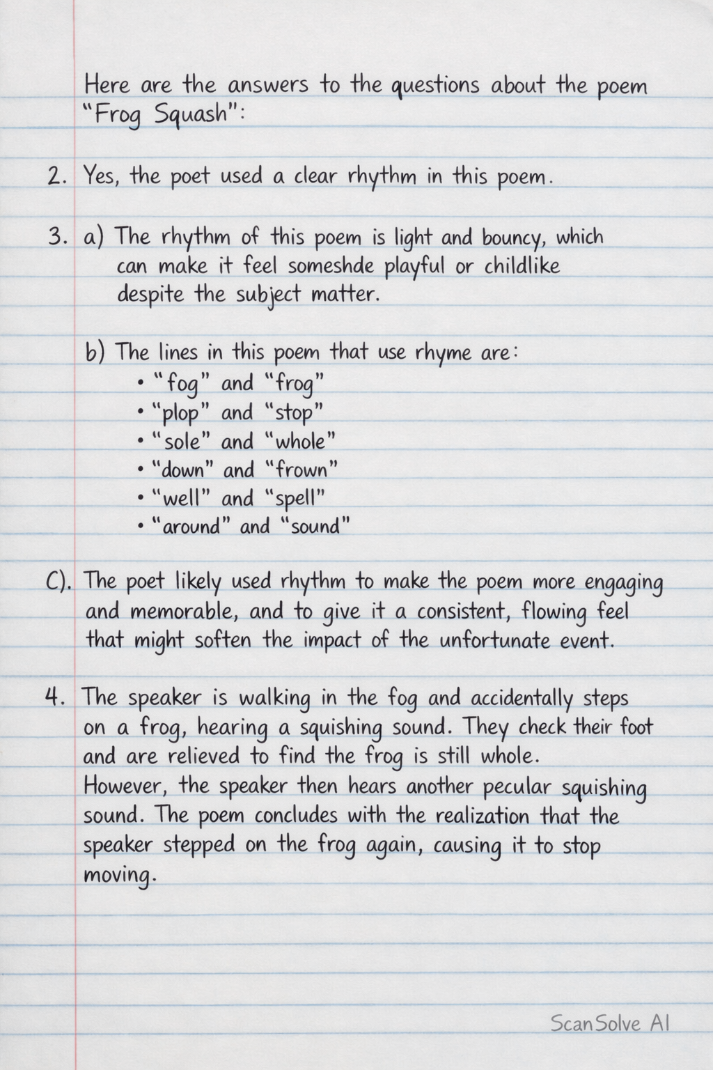 a) The rhythm of this poem is light and bouncy, which can make it feel somewhat playful or childlike despite the subject matter. b) The lines in this poem that use rhyme are: • "fog" and "frog" • "plop" and "stop" • "sole" and "whole" • "down" and "frown" • "well" and "spell" • "around" and "sound" c) The poet likely used rhythm to make the poem more engaging and memorable, and to give it a consistent, flowing feel that might soften the impact of the unfortunate event.