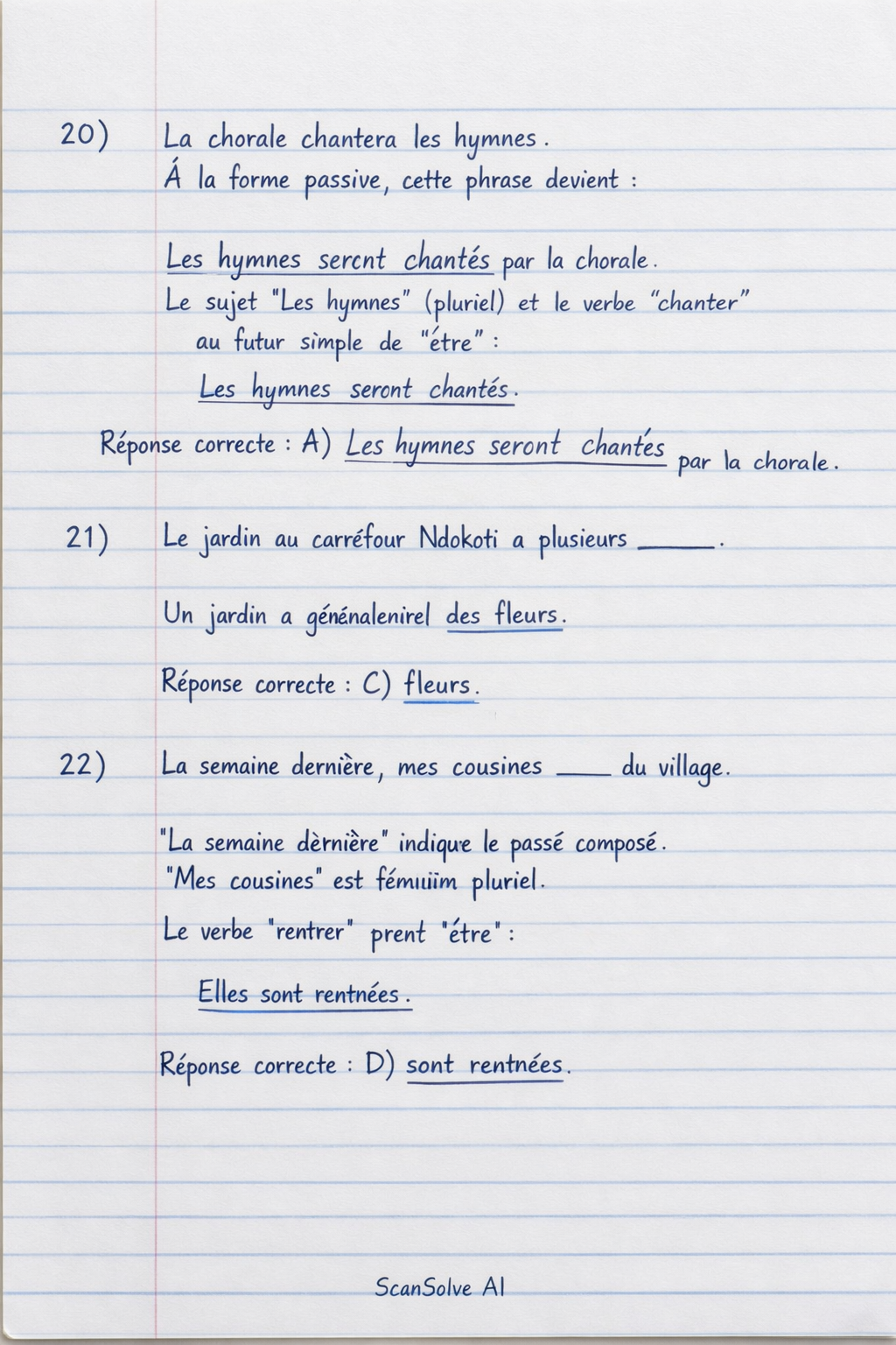 20) "La chorale chantera les hymnes". À la forme passive, cette phrase devient :