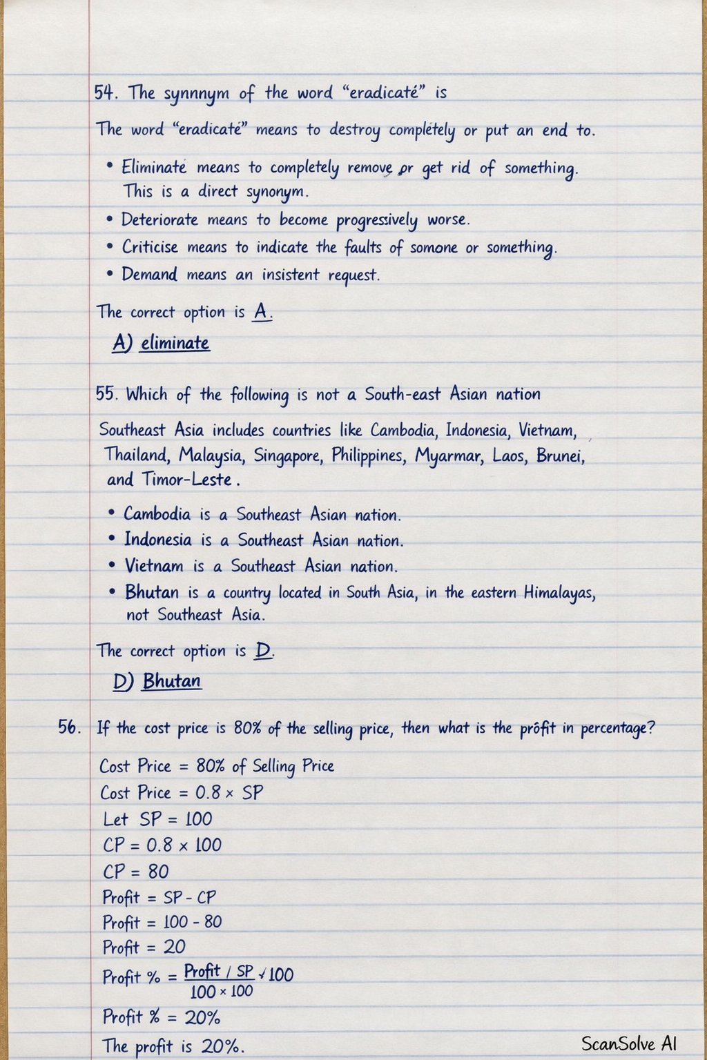 56. If the cost price is 80% of the selling price, then what is the profit in percentage?