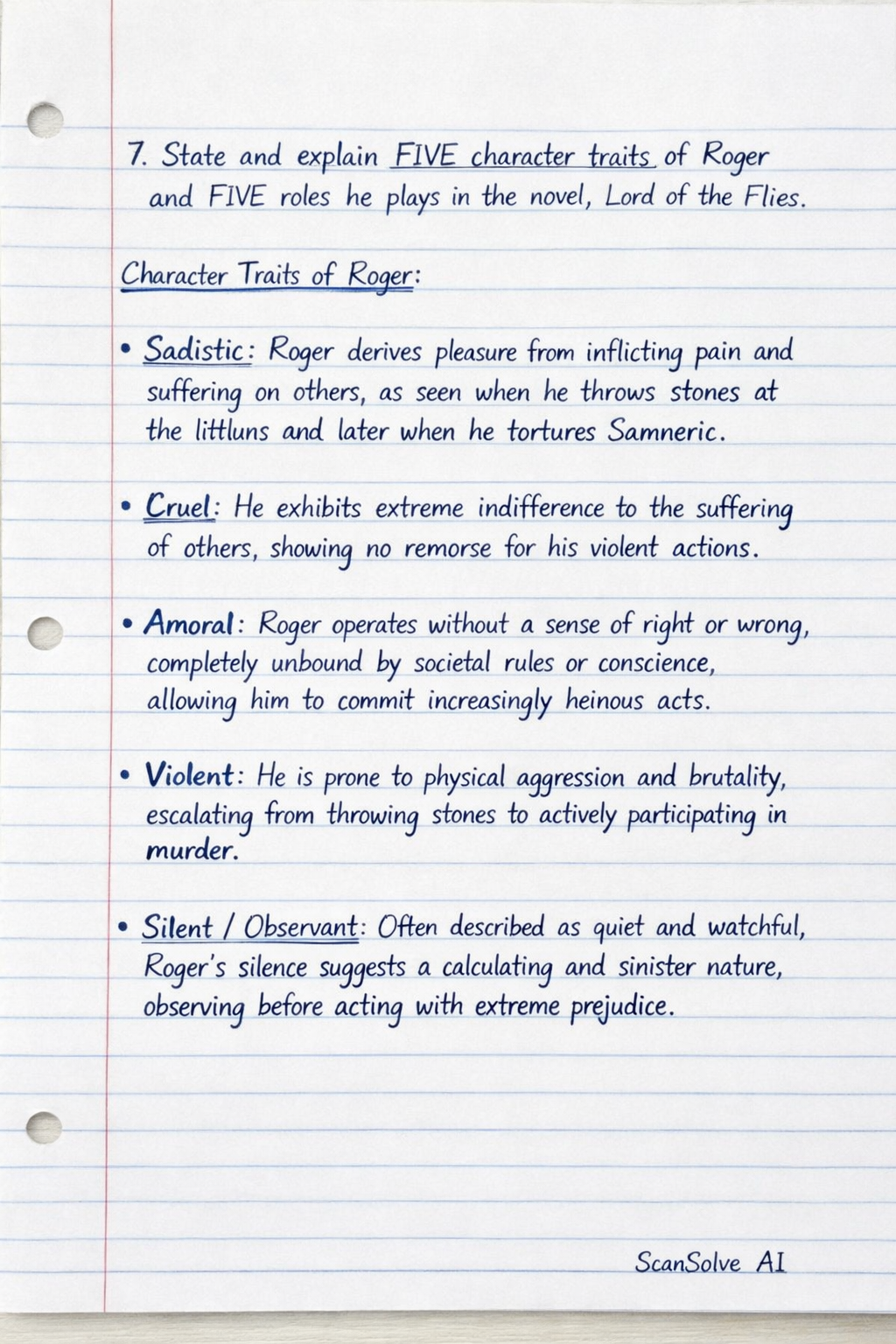 7. State and explain FIVE character traits of Roger and FIVE roles he plays in the novel, Lord of the Flies.
