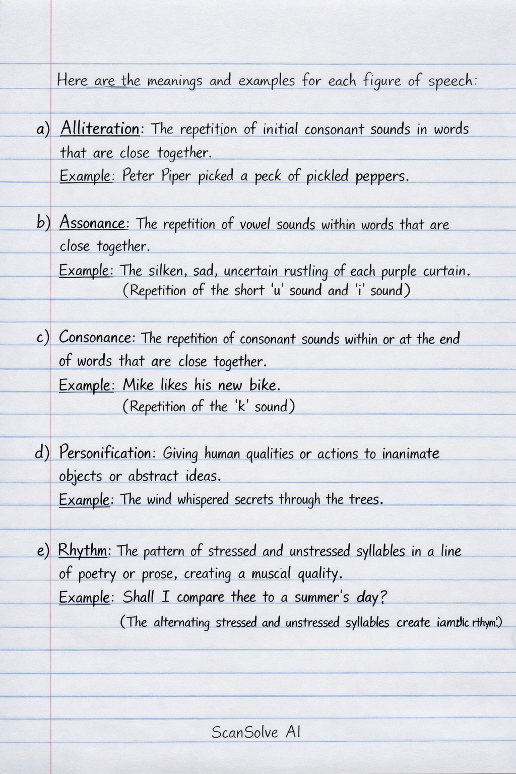 f) Rhyme: The repetition of similar sounding words, usually at the end of lines in poetry.