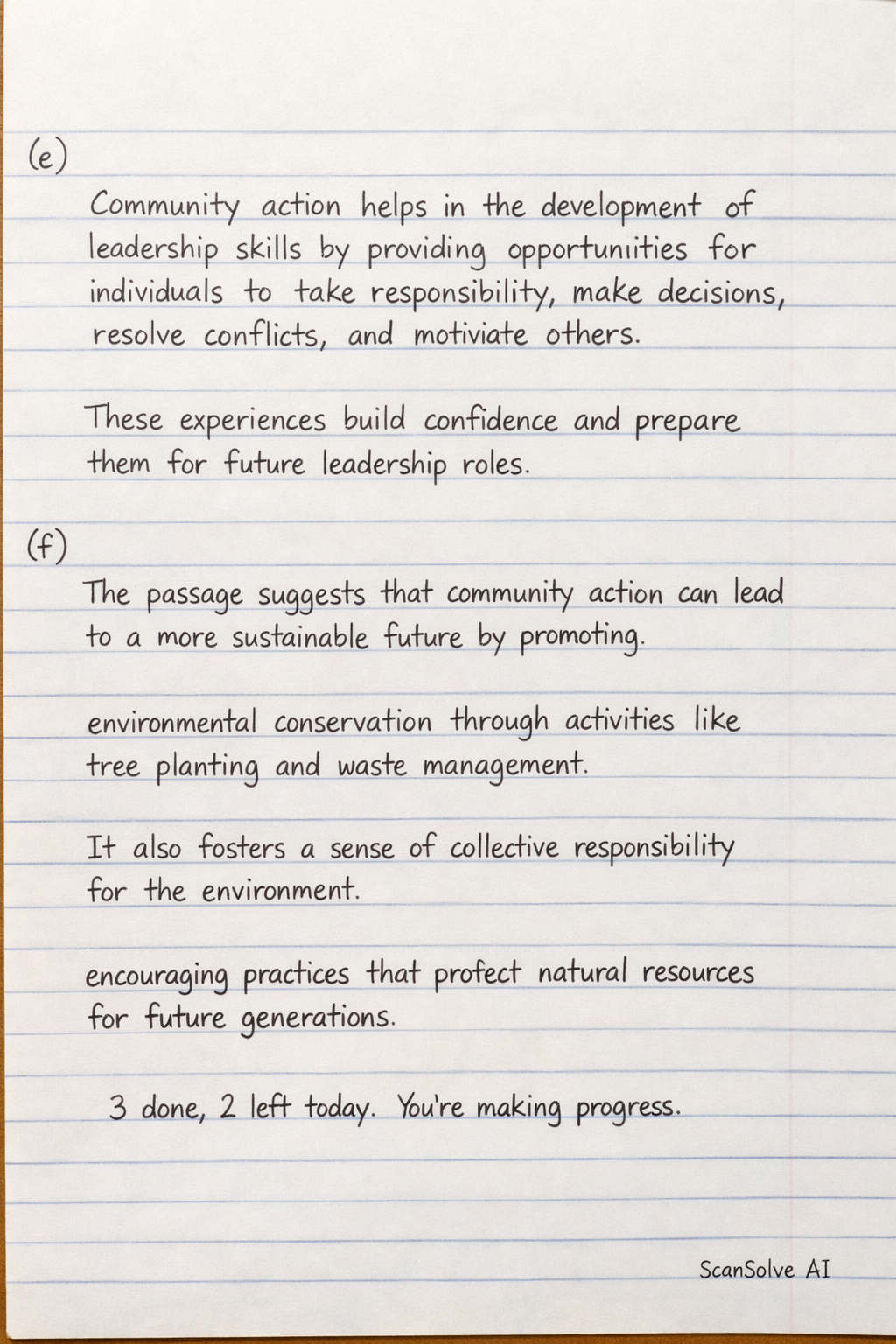 e) Community action helps in the development of leadership skills by providing opportunities for individuals to take responsibility, make decisions, resolve conflicts, and motivate others. These experiences build confidence and prepare them for future leadership roles.
