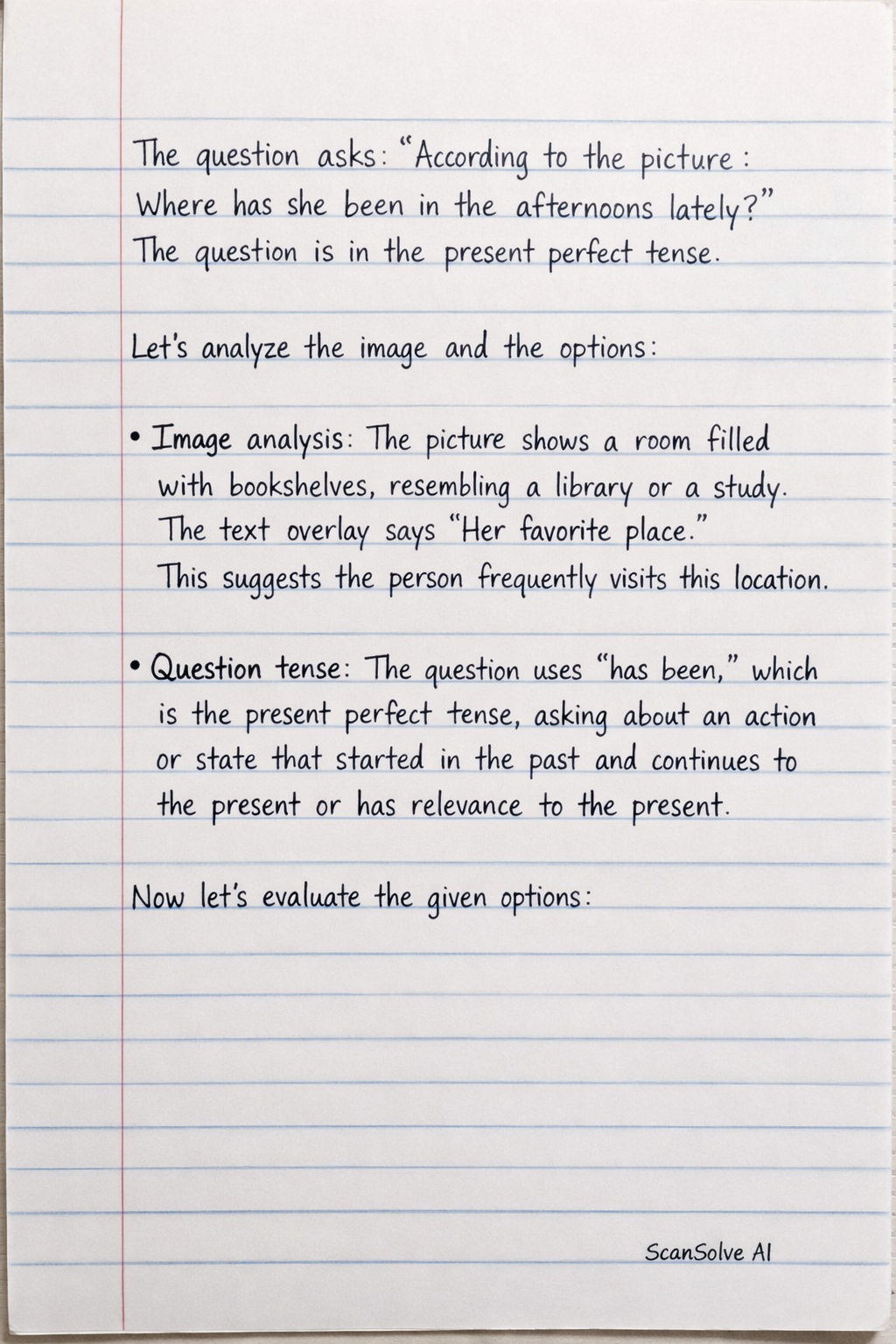 The question asks: "According to the picture: Where has she been in the afternoons lately?" The question is in the present perfect tense.