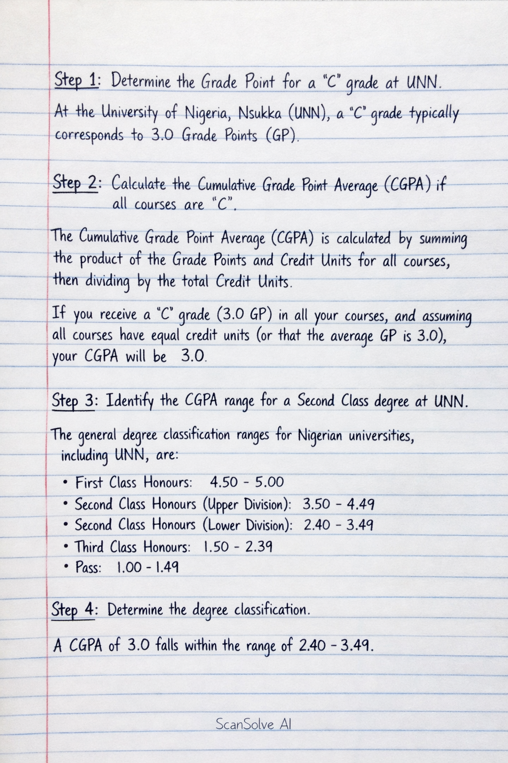 At the University of Nigeria, Nsukka (UNN), a 'C' grade typically corresponds to 3.0 Grade Points (GP).