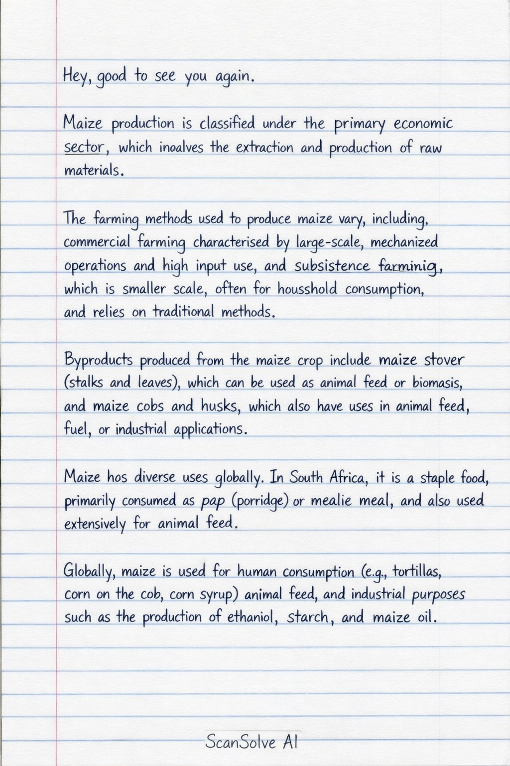 Maize production is classified under the primary economic sector, which involves the extraction and production of raw materials. The farming methods used to produce maize vary, including commercial farming characterized by large-scale, mechanized operations and high input use, and subsistence farming, which is smaller scale, often for household consumption, and relies on traditional methods.