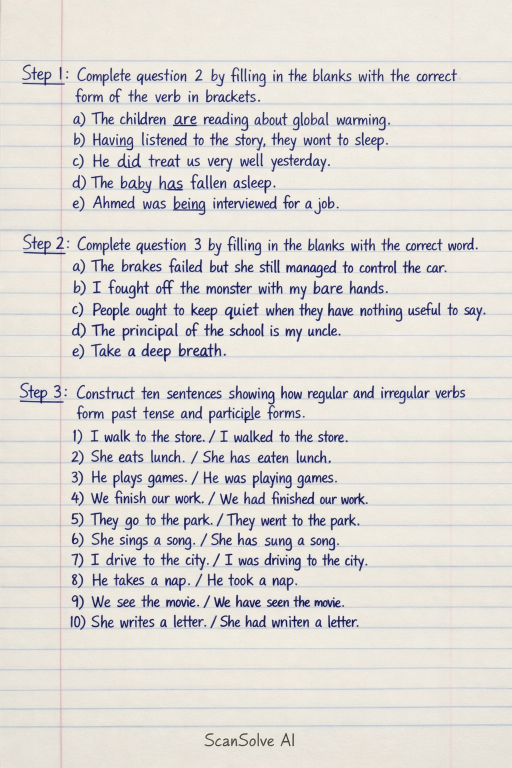 Step 3: Construct ten sentences showing how regular and irregular verbs form past tense and participle forms within different aspects for question 4.