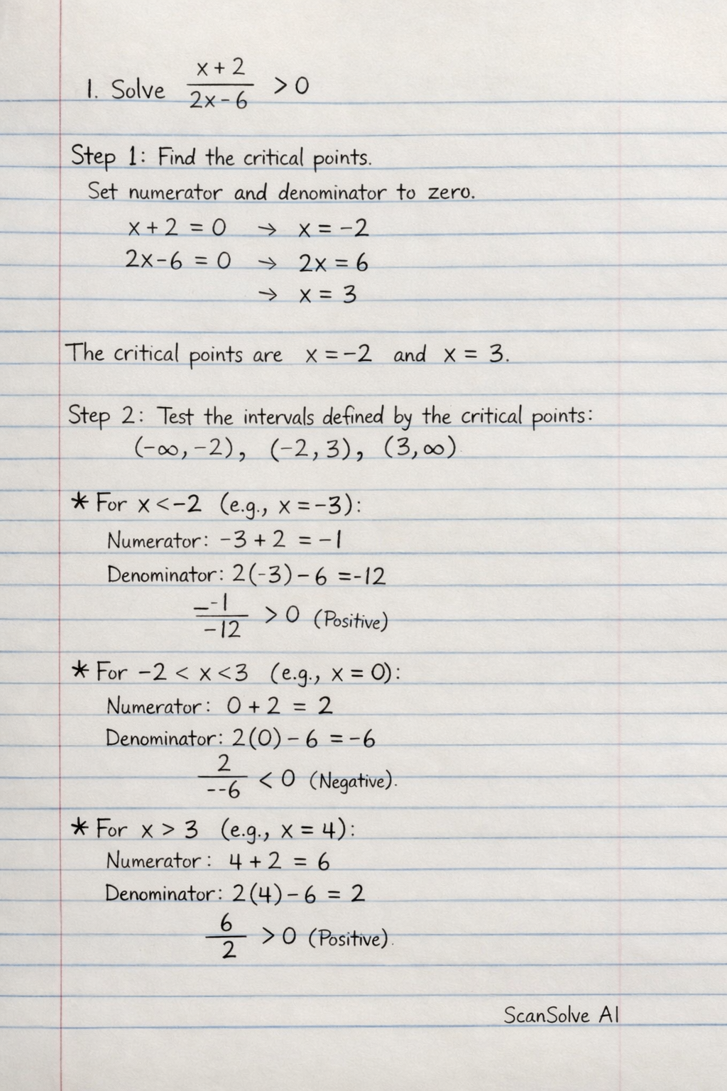 Step 2: Test intervals defined by the critical points: (−∞,−2), (−2,3), and (3,∞).