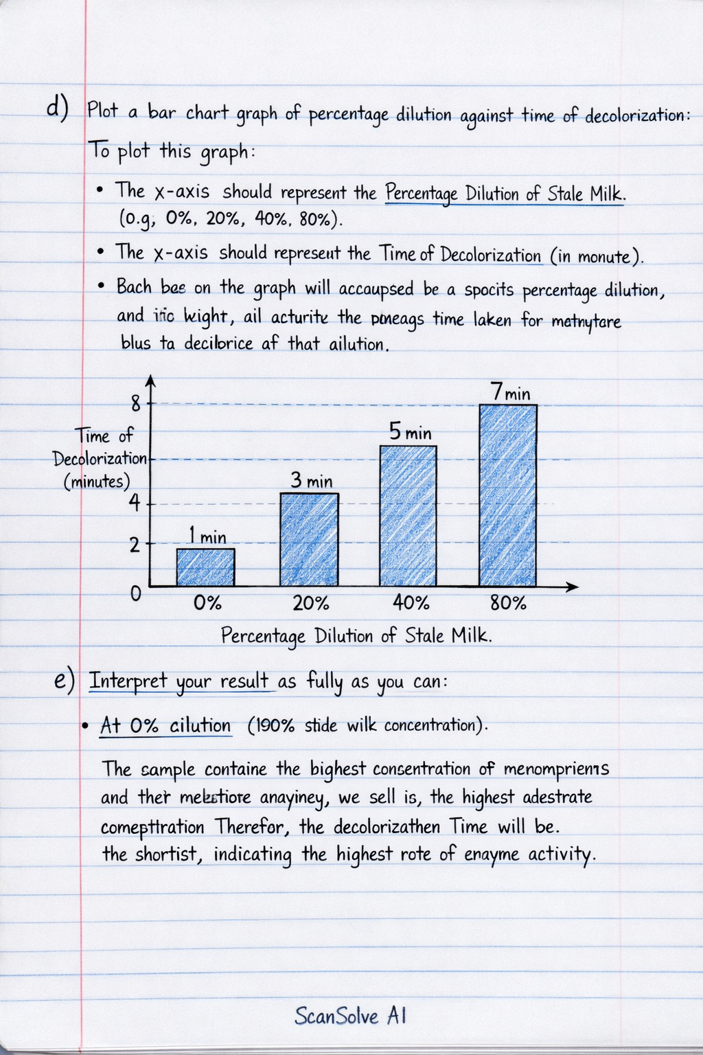 • Each bar on the graph will correspond to a specific percentage dilution, and its height will indicate the average time taken for methylene blue to decolorize at that dilution.