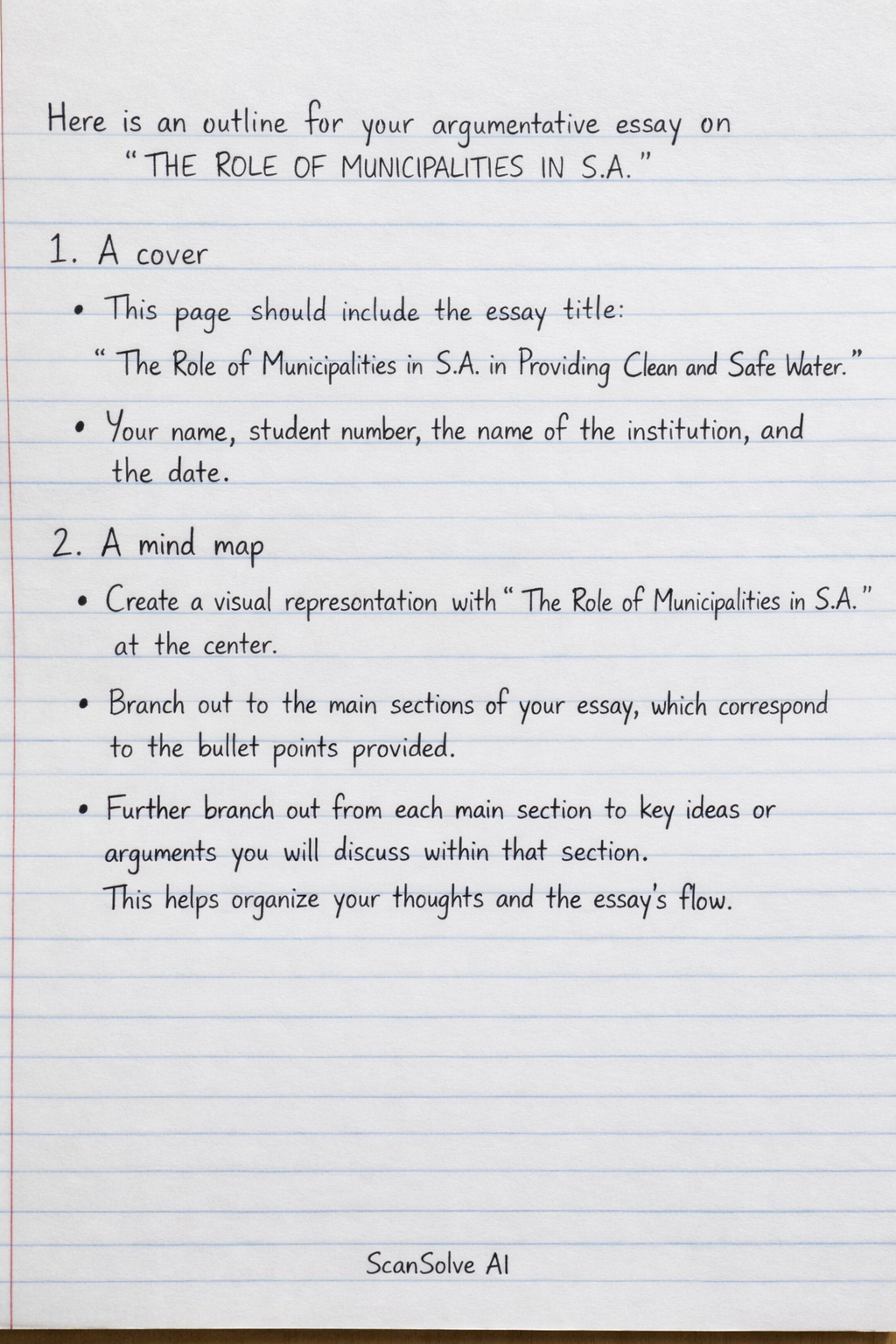 Here is an outline for your argumentative essay on "THE ROLE OF MUNICIPALITIES IN S.A.", addressing all the required components and bullet points: Essay Structure and Content A cover This page should include the essay title: The Role of Municipalities in S.A. in Providing Clean and Safe Water*. Your name, student number, the name of the institution, and the date. A mind map Create a visual representation with "The Role of Municipalities in S.A." at the center. Branch out to the main sections of your essay, which correspond to the bullet points provided. Further branch out from each main section to key ideas or arguments you will discuss within that section. This helps organize your thoughts and the essay's flow. An Introduction Address the question: Why is water so important?* Begin by highlighting the fundamental importance of water for human survival, health, economic development, and environmental sustainability. State the essay's purpose: to explore the critical role of municipalities in South Africa in ensuring access to clean and safe water, examining their responsibilities, management practices, challenges, impacts of poor management, and potential strategies for improvement. A body and lock (Body paragraphs and Conclusion) Body Paragraph 1: Municipal Responsibilities Address the question: What responsibilities do municipalities have to provide clean and safe water to communities?* Discuss the constitutional mandate and legal obligations of municipalities to ensure access to basic water supply and sanitation services. Detail responsibilities such as source water protection, water treatment, distribution network maintenance, quality monitoring, and ensuring equitable access. Body Paragraph 2: Management of Water Purification Systems Address the question: How do municipalities manage and maintain water purification systems?* Explain the typical stages of water purification (e.g., coagulation, flocculation, sedimentation, filtration, disinfection). Describe the operational management of water treatment plants, infrastructure maintenance (pipes, pumps, reservoirs), and the role of skilled personnel in ensuring system efficiency and water quality. Body Paragraph 3: Challenges Faced by Municipalities Address the question: What challenges do municipalities face in providing reliable water services?* Discuss issues such as aging infrastructure, insufficient funding, rapid urbanization, climate change impacts (droughts, floods), water pollution, illegal connections, skills shortages, and governance issues like corruption or political interference. Body Paragraph 4: Impacts of Poor Water Management Address the question: How does poor water management at the municipal level affect communities and the environment?* For communities: Discuss health risks (waterborne diseases), economic hardship, social instability, and reduced quality of life. For the environment: Explain impacts like pollution of water sources, degradation of ecosystems, and loss of biodiversity. Conclusion (The "lock") Address the question: What strategies can municipalities implement to improve water supply and treatment services?* Summarize the main arguments presented in the essay regarding the importance of water, municipal roles, challenges, and impacts. Propose concrete strategies for improvement, such as investing in infrastructure upgrades, adopting new technologies, capacity building for staff, fostering public-private partnerships, implementing water conservation measures, strengthening regulatory enforcement, and promoting community engagement. End with a strong concluding statement emphasizing the critical need for effective municipal water management for the well-being of South African communities and the environment. A Bibliography List all sources you consulted or cited in your essay. Ensure consistent formatting according to a recognized citation style (e.g., Harvard, APA, MLA). That's 2 down. 3 left today — send the next one.