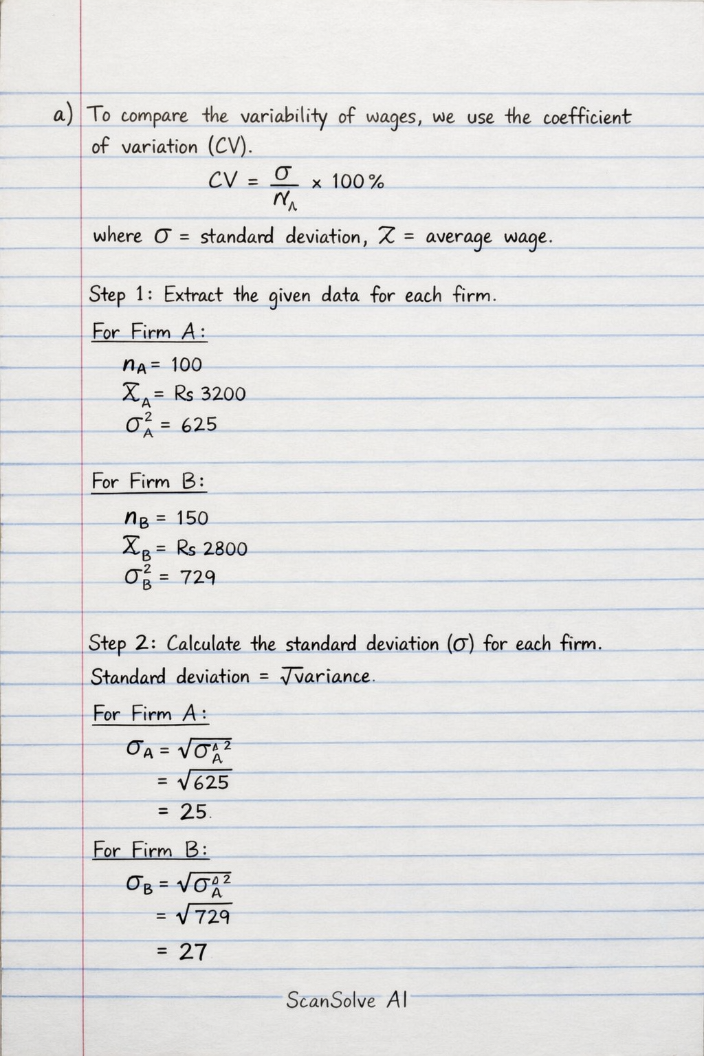 Here's the solution to the problem: a) To determine which firm has greater variability in individual wages, we compare their coefficients of variation (CV).