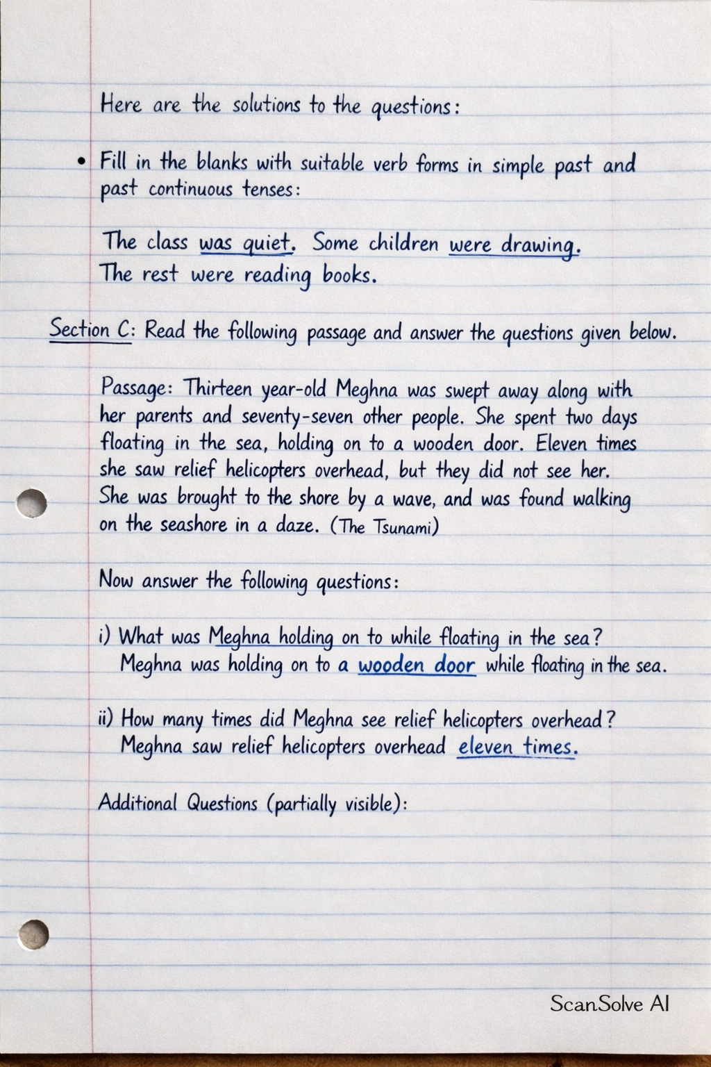 Passage: Thirteen year-old Meghna was swept away along with her parents and seventy-seven other people. She spent two days floating in the sea, holding on to a wooden door. Eleven times she saw relief helicopters overhead, but they did not see her. She was brought to the shore by a wave, and was found walking on the seashore in a daze. (The Tsunami)