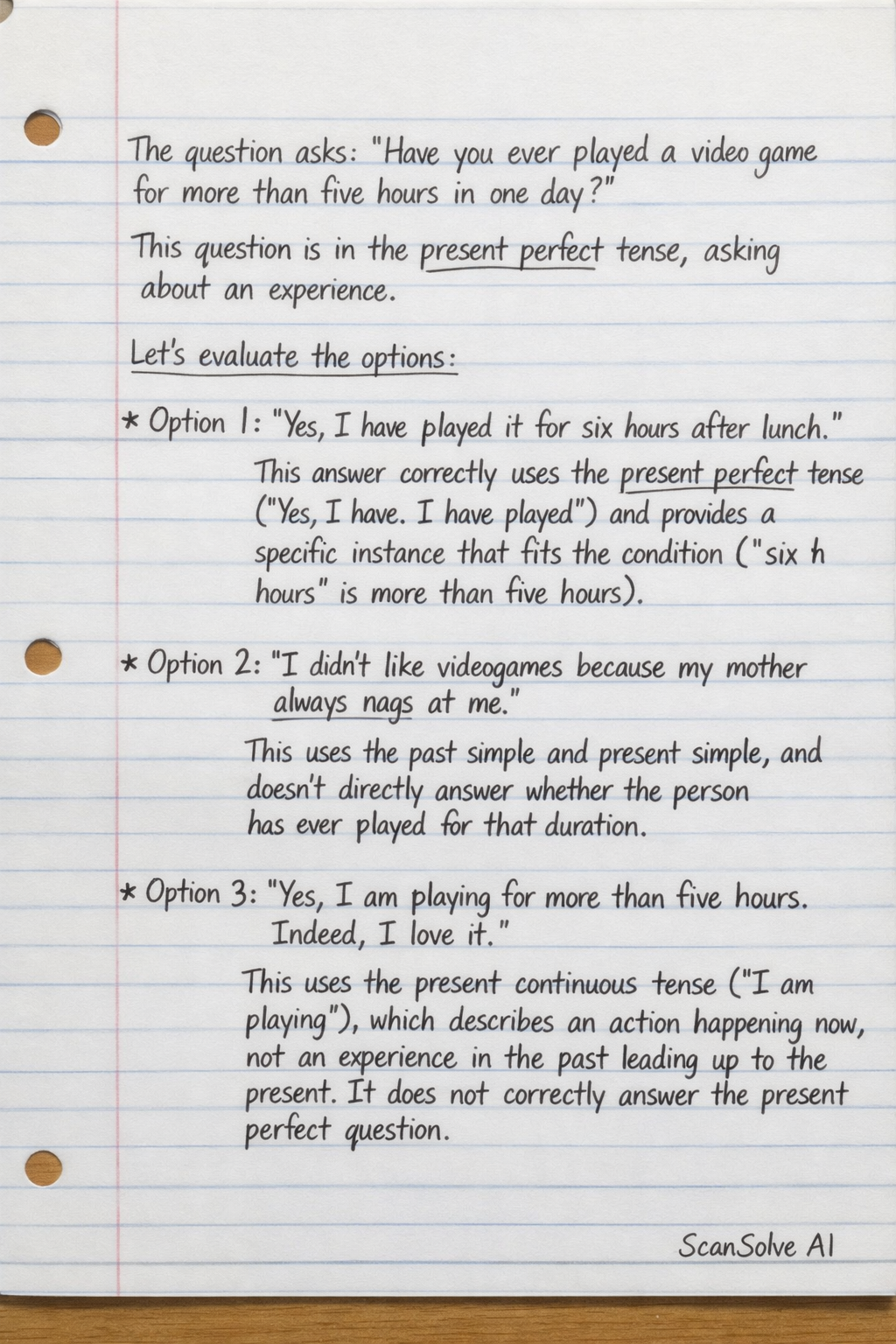 - Option 1: "Yes, I have. I have played it for six hours after lunch." This answer correctly uses the present perfect tense ("Yes, I have. I have played") and provides a specific instance that fits the condition ("six hours" is more than five hours).
