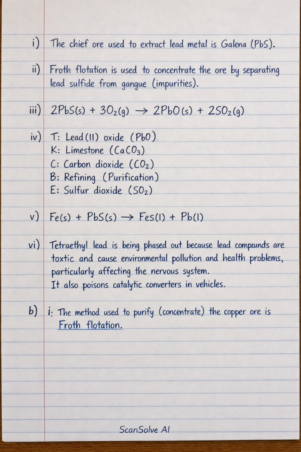 ii) At the purification stage, froth flotation is used to concentrate the ore by separating lead sulfide from gangue (impurities).