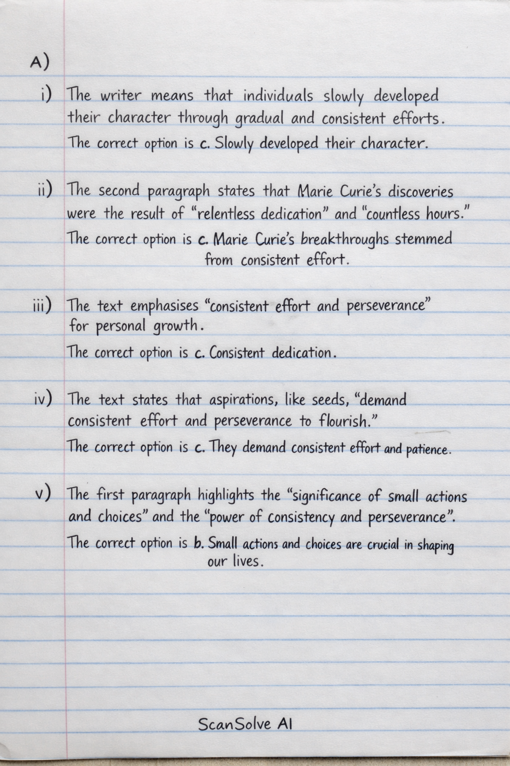 ii) The second paragraph states that Marie Curie's discoveries were the result of "relentless dedication" and "countless hours."