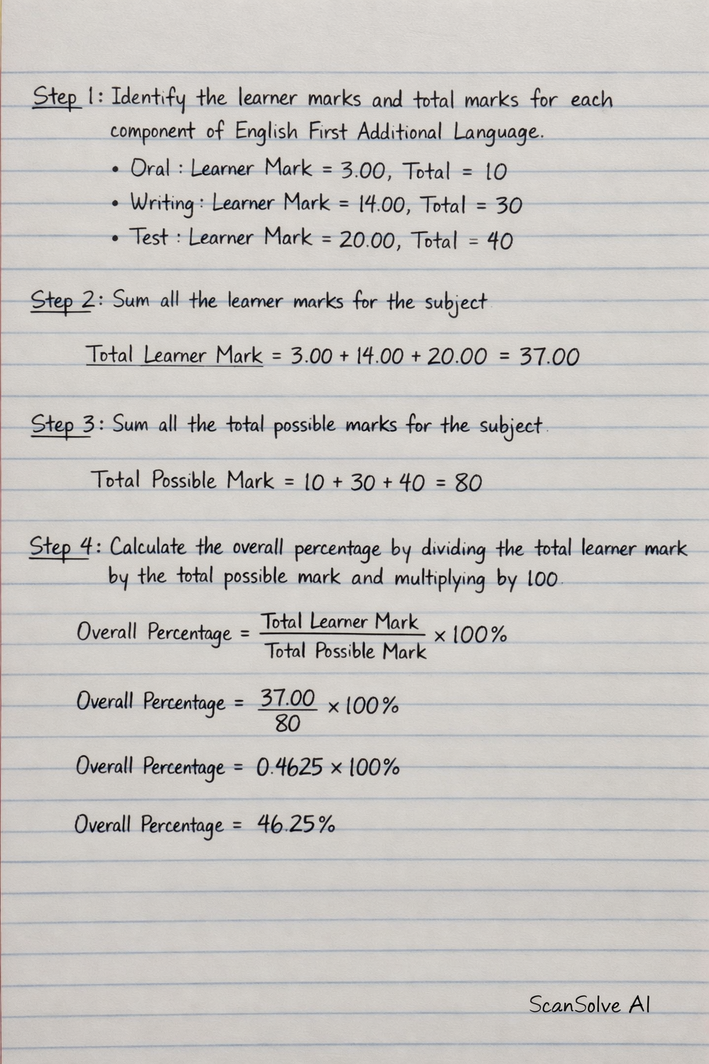 Step 1: Identify the learner marks and total marks for each component of English First Additional Language.