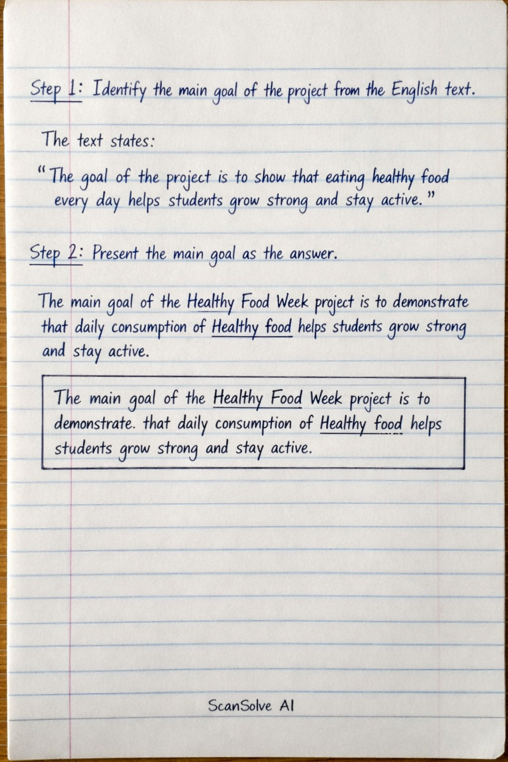 Step 2: Present the main goal as the answer. The main goal of the Healthy Food Week project is to demonstrate that daily consumption of healthy food helps students grow strong and stay active.