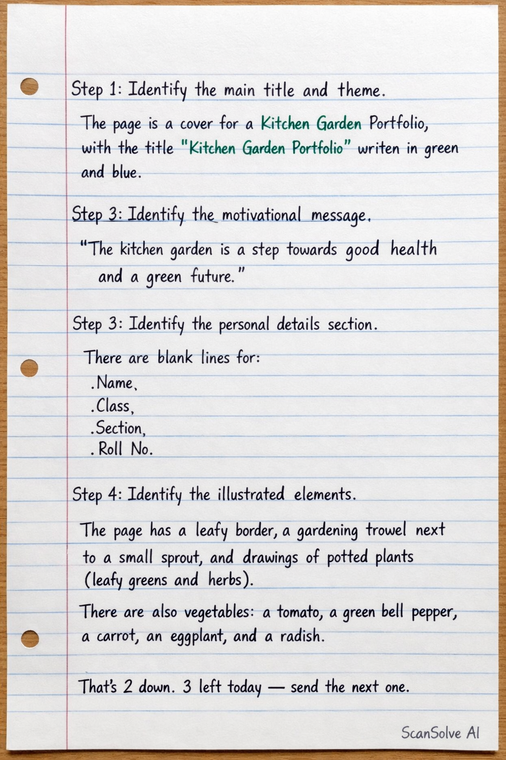 Step 1: Identify the main title and theme. The page is a cover for a Kitchen Garden Portfolio, with the title "Kitchen Garden Portfolio" written in green and blue.