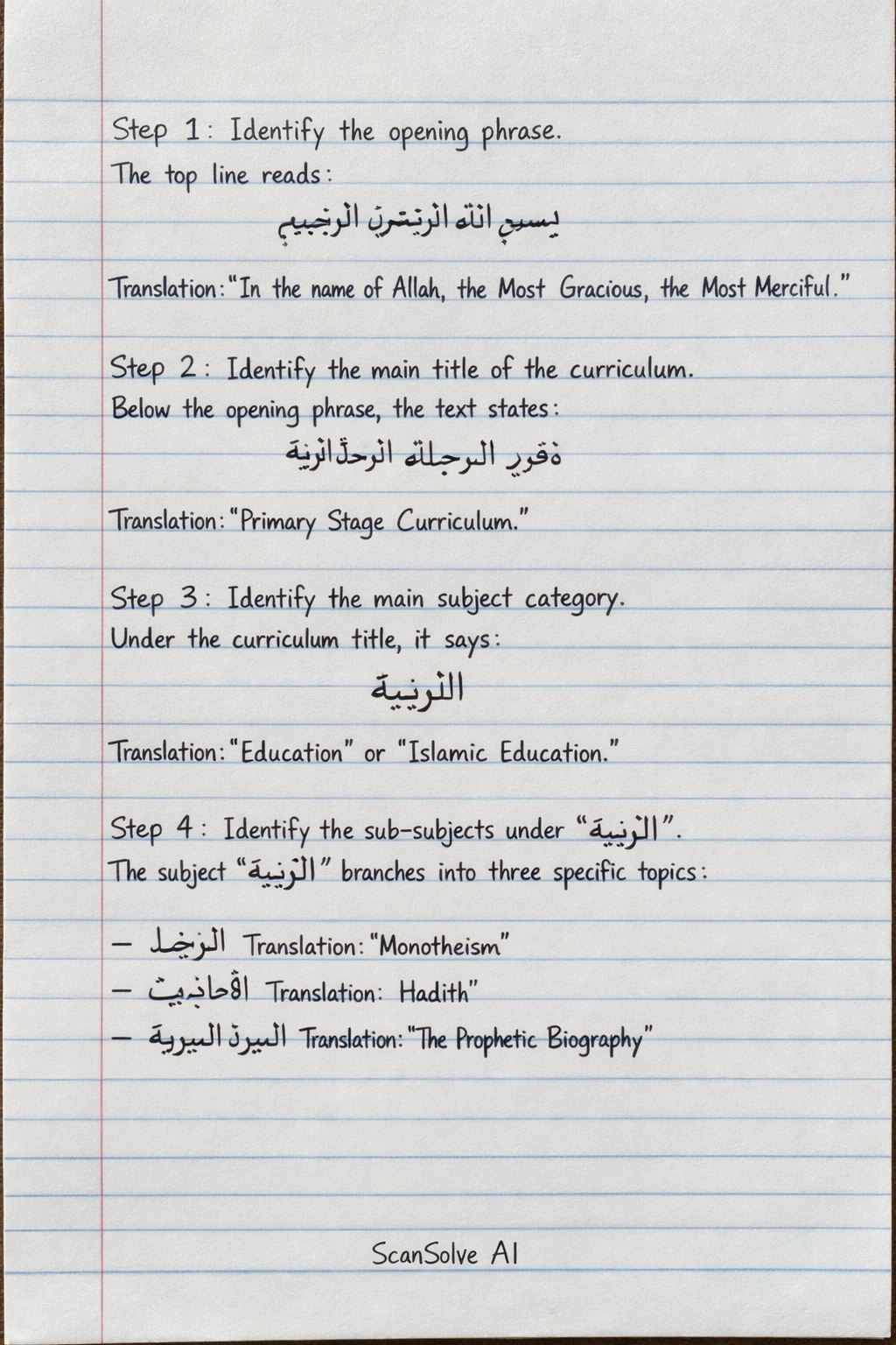 Step 3: Identify the main subject category. Under the curriculum title, a main subject is listed: This translates to: Education or Islamic Education.