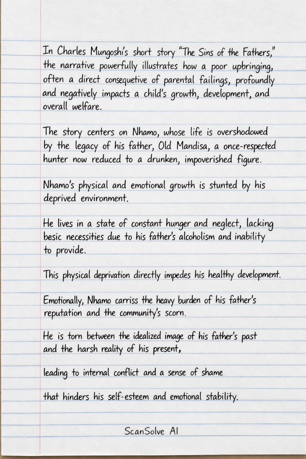 In Charles Mungoshi's short story "The Sins of the Fathers," the narrative powerfully illustrates how a poor upbringing, often a direct consequence of parental failings, profoundly and negatively impacts a child's growth, development, and overall welf…