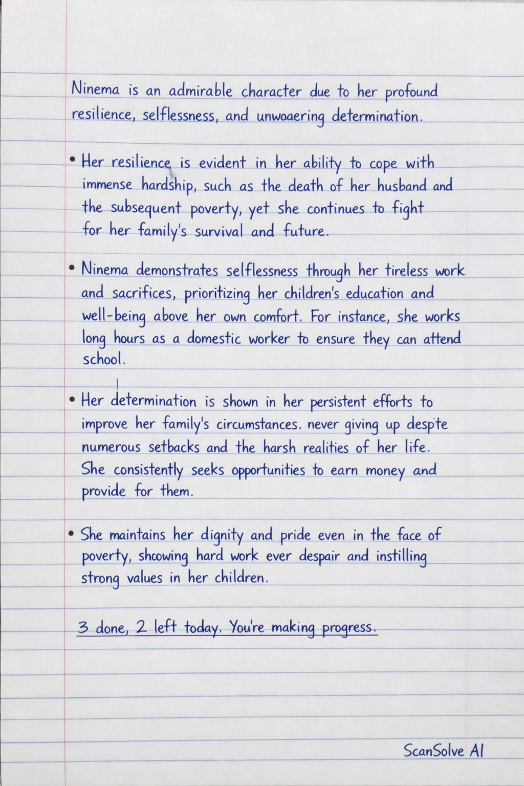 • Her resilience is evident in her ability to cope with immense hardship, such as the death of her husband and the subsequent poverty, yet she continues to fight for her family's survival and future. • Ninema demonstrates selflessness through her tireless work and sacrifices, prioritizing her children's education and well-being above her own comfort. For instance, she works long hours as a domestic worker to ensure they can attend school. • Her determination is shown in her persistent efforts to improve her family's circumstances, never giving up despite numerous setbacks and the harsh realities of her life. She consistently seeks opportunities to earn money and provide for them. • She maintains her dignity and pride even in the face of poverty, choosing hard work over despair and instilling strong values in her children.