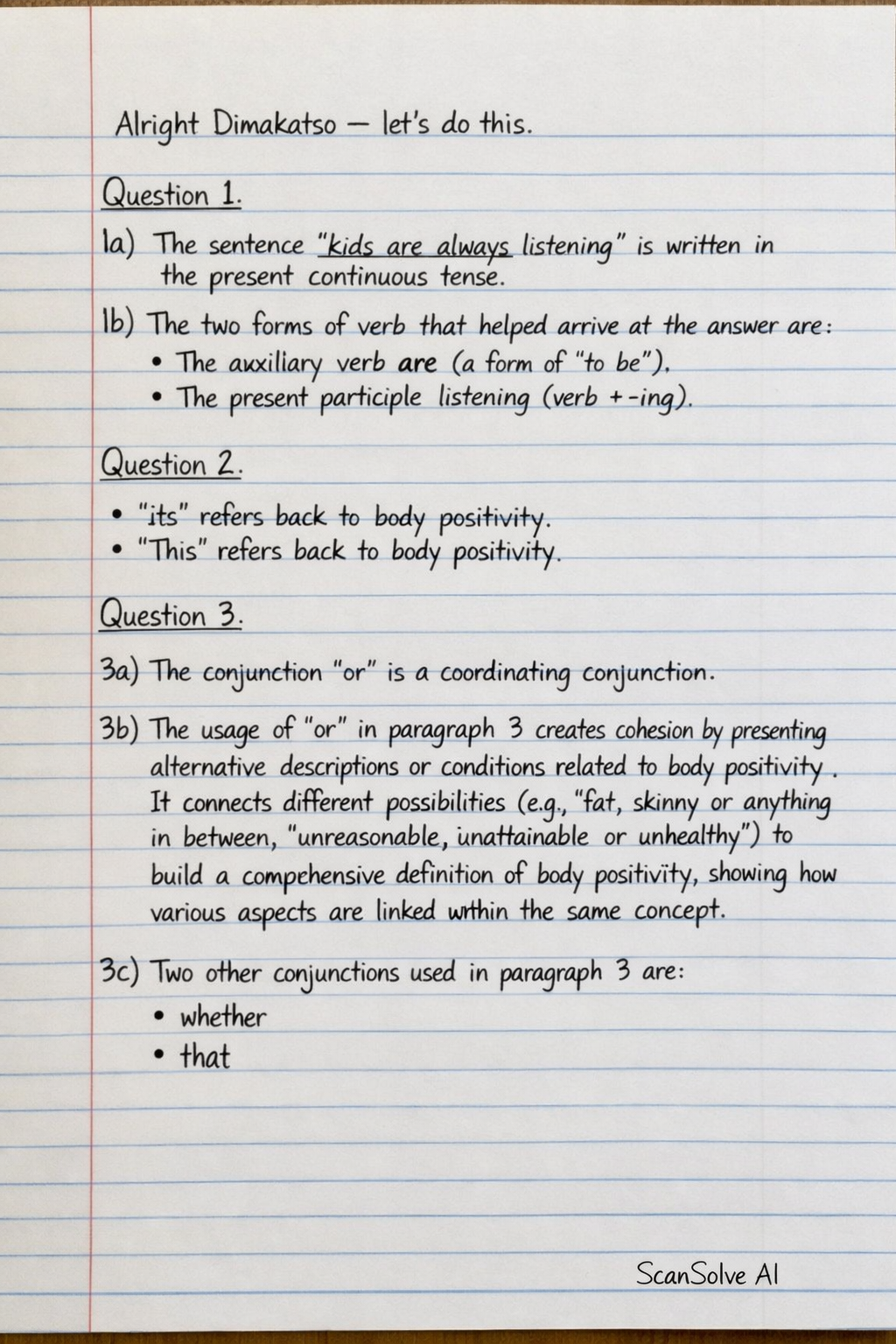 3b) The usage of "or" in paragraph 3 creates cohesion by presenting alternative descriptions or conditions related to body positivity. It connects different possibilities (e.g., "fat, skinny or anything in between," "unreasonable, unattainable or unhealthy") to build a comprehensive definition of body positivity, showing how various aspects are linked within the same concept.
