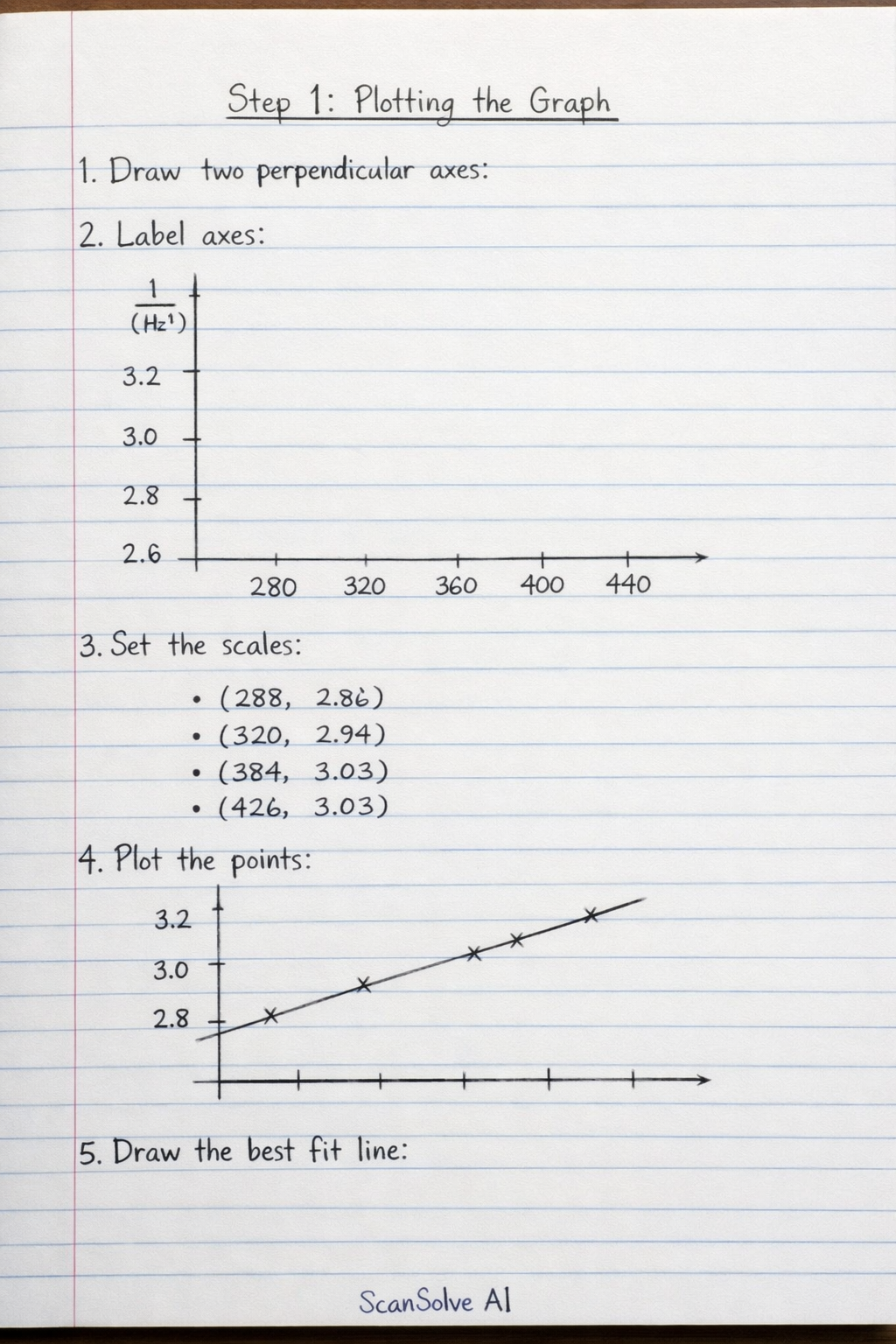 To plot the graph of the inverse of mean (interpreted as ) against frequency, follow these steps: • Draw two perpendicular axes on graph paper. • Label the horizontal axis (x-axis) as "Frequency () (Hz)" and the vertical axis (y-axis) as " (m)". • Choose appropriate scales for both axes so that all data points fit and the graph fills most of the page. • Plot the data points from your table with Frequency on the x-axis and on the y-axis: * * * * • Draw a straight line that best fits the plotted points. This line should pass as close as possible to all points, with roughly an equal number of points above and below it.