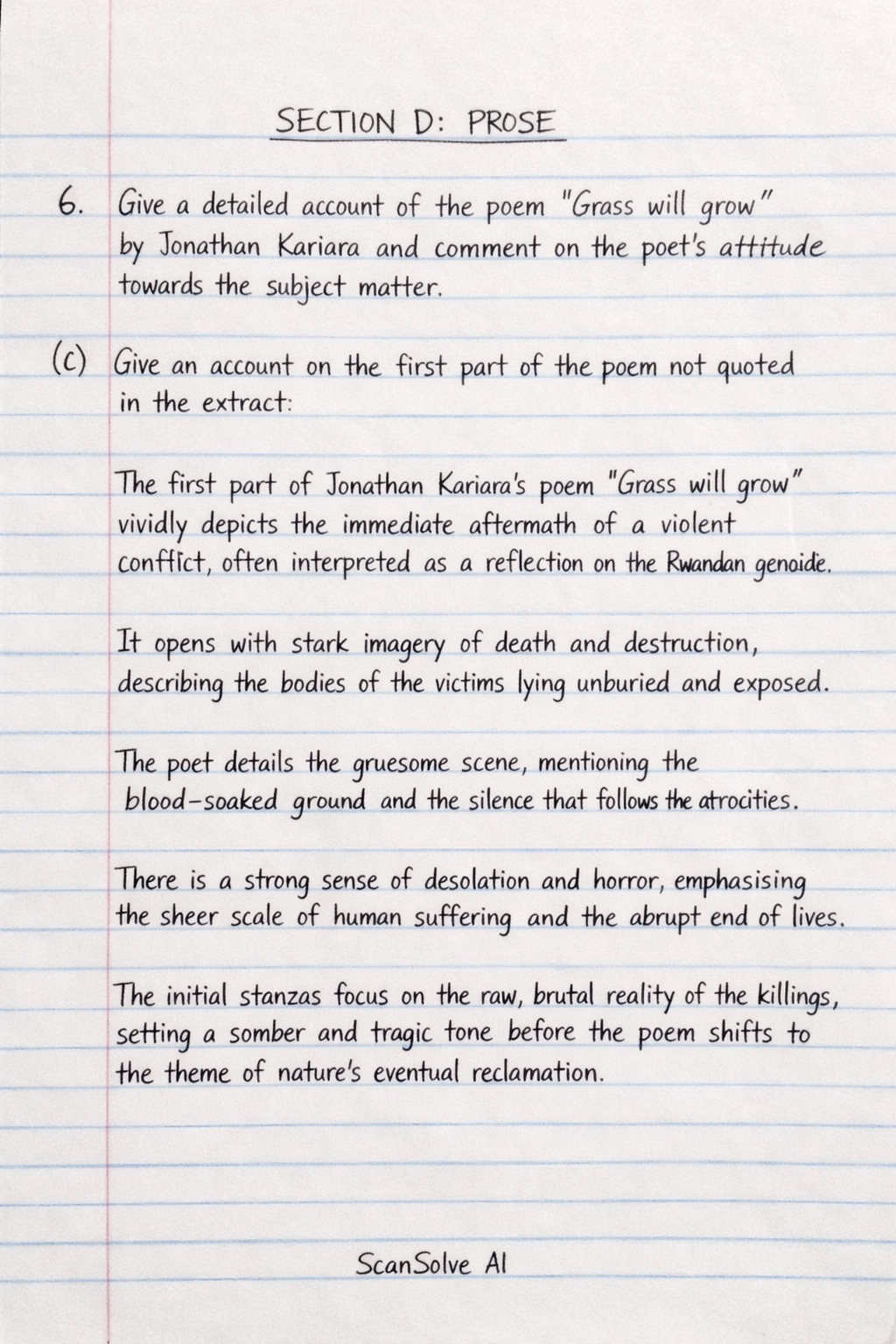 d) Comment on the poet's attitude towards his/her subject matter in the poem. The poet's attitude towards the subject matter is one of profound lament and condemnation of human brutality, coupled with a sense of resignation to nature's indifference. Kariara expresses deep sorrow for the victims and criticizes the senseless violence that leads to such widespread death. However, there is also an underlying tone of irony and fatalism as the poet observes nature's relentless cycle. The grass will grow, covering the scars of human conflict, suggesting that while human actions cause immense suffering, nature ultimately reclaims its domain, erasing the immediate evidence of atrocity. This highlights the transient nature of human existence and the enduring power of the natural world.