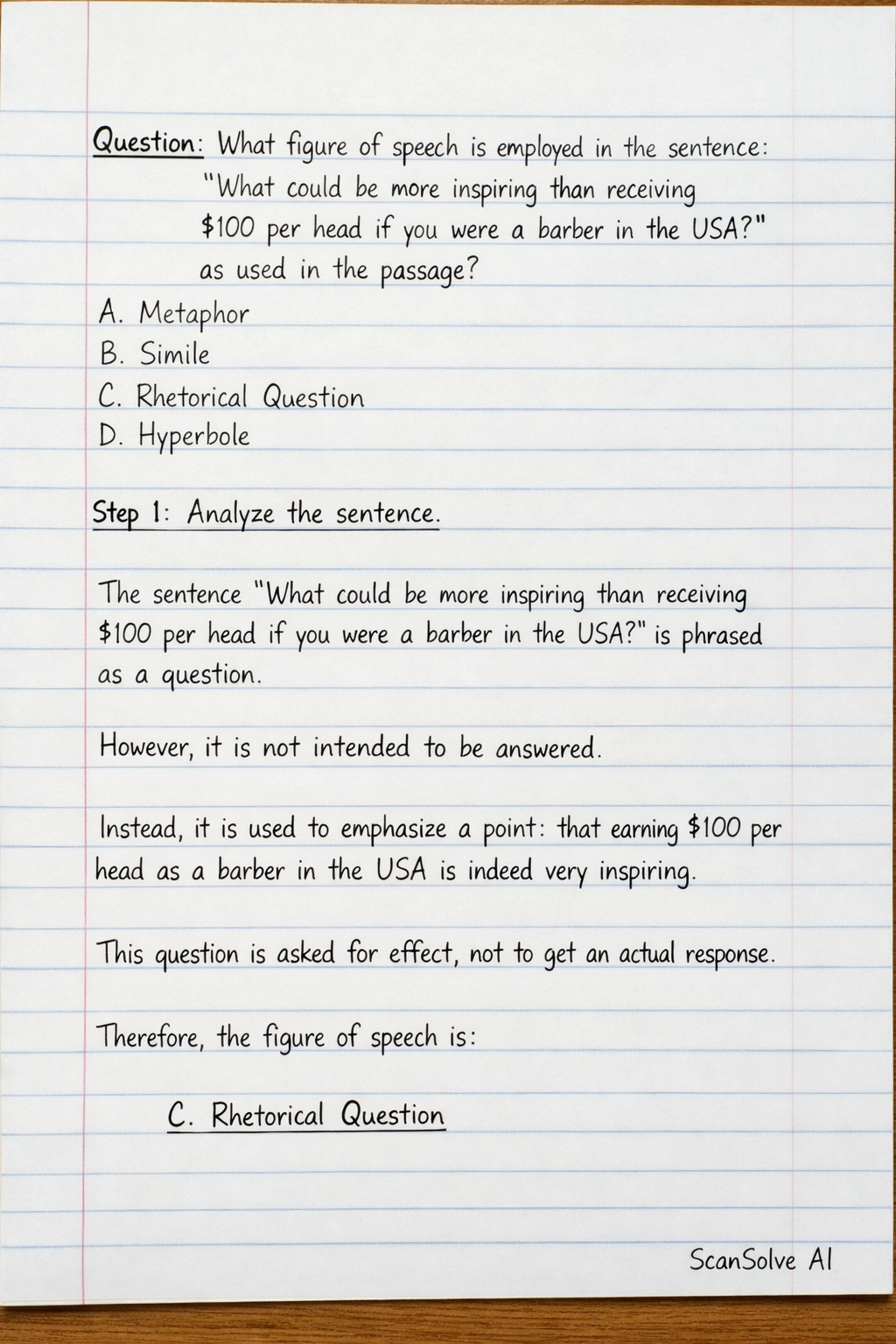 "What figure of speech is employed in the sentence, 'What could be more inspiring than receiving $100 per head if you were a barber in the USA?' as used in the passage?"