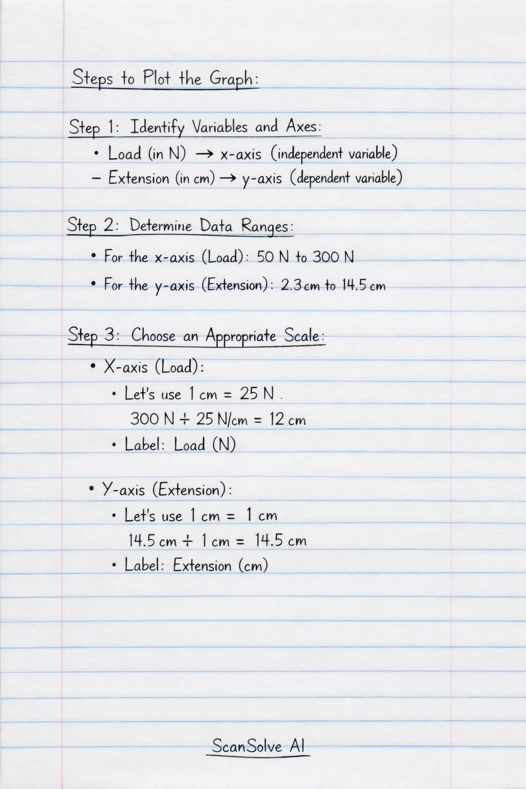 Step 3: Choose an Appropriate Scale • X-axis (Load): Choose a scale that allows all load values to fit comfortably. For example, on your graph paper could represent or . Label the axis "Load (N)". • Y-axis (Extension): Choose a scale that allows all extension values to fit. For example, on your graph paper could represent or . Label the axis "Extension (cm)".