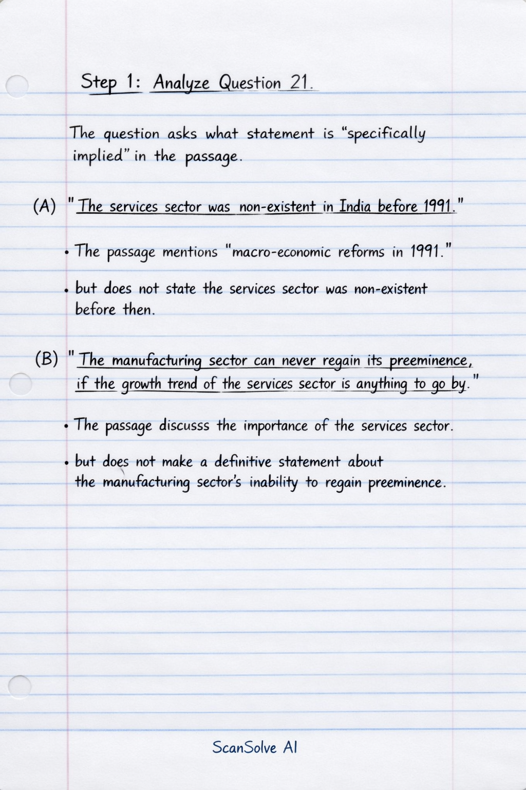 - (C) "if not for the service sector, the Indian economy would have remained stagnant after 1991." The passage highlights the importance of the service sector but doesn't explicitly state that the economy would have been stagnant without it. It mentions "successful macro-economic reforms in 1991" and "stable monetary and fiscal policies" as contributing factors.